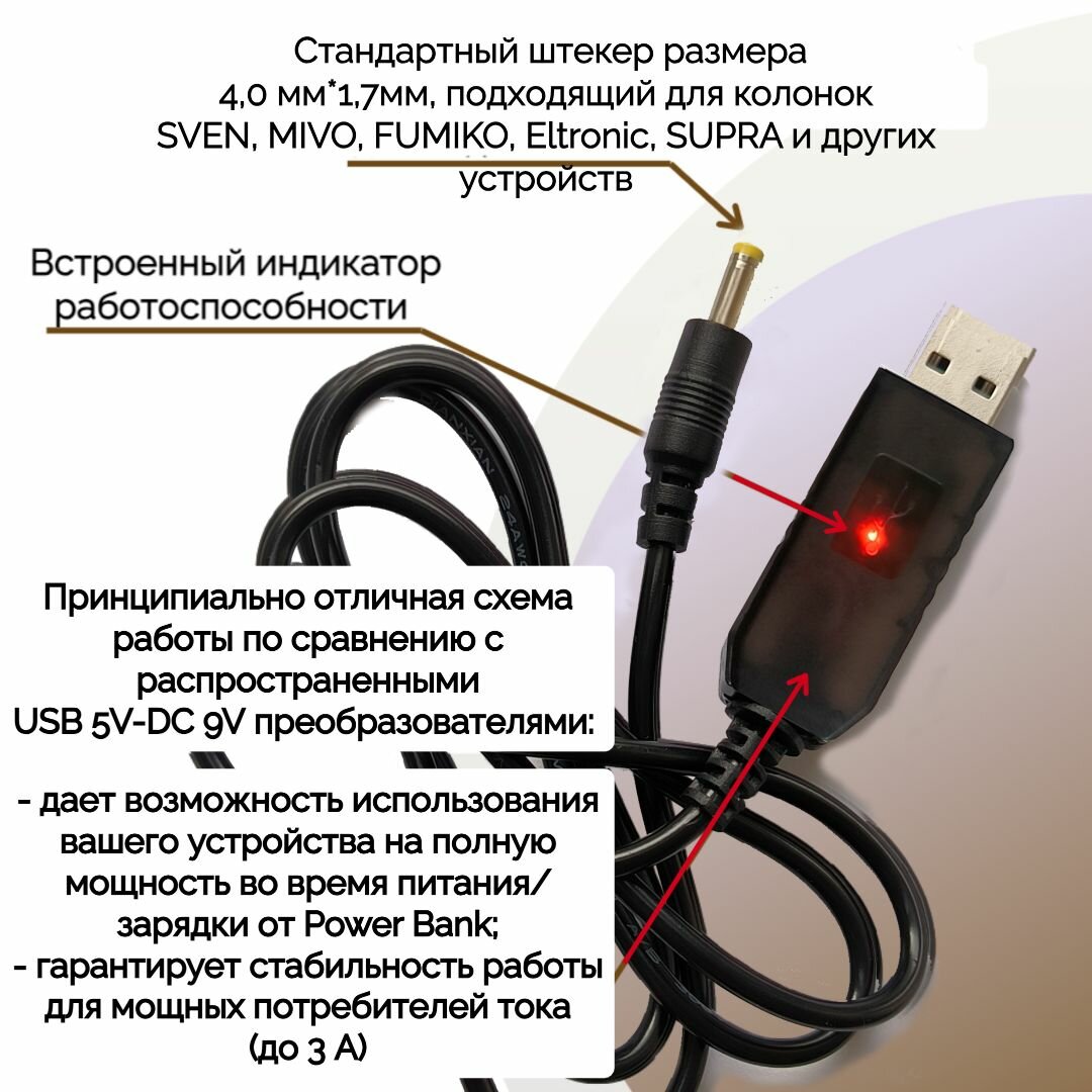 Кабель питания/зарядки от пауэрбанка (с поддержкой QC2.0/3.0) для колонок SVEN, MIVO, Eltronic, FUMIKO и других устройств (9 вольт, USB - DC 4,0*1,7, 3А)) - черный