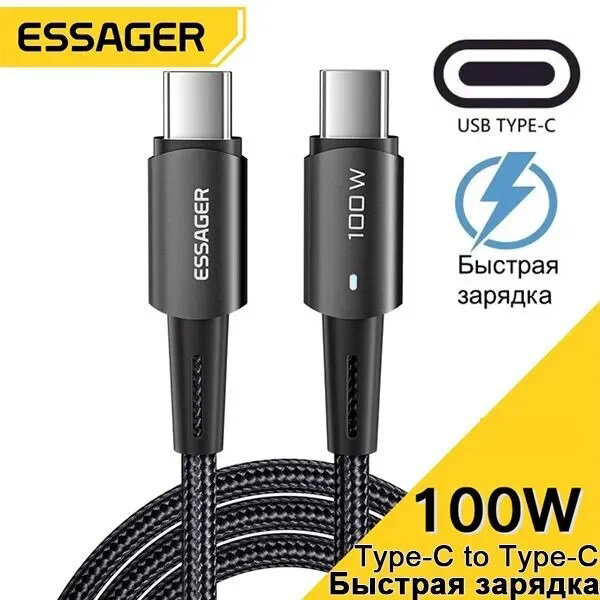 Кабель Essager Type-c-Type-c для быстрой зарядки и передачи данных, max 100W, 5 A, 480 Mbps, 3 метра, Quick Charge 3.0/4.0 (Черный) интересное: