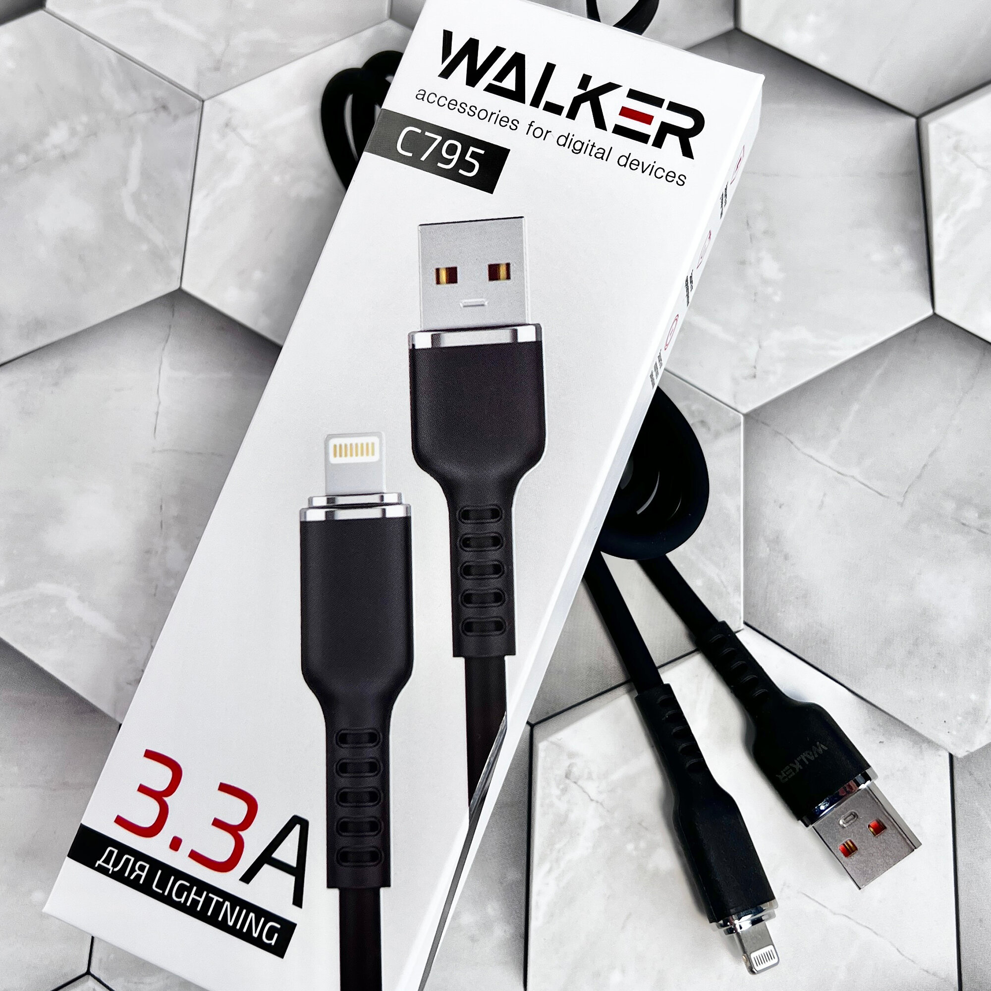 Кабель USB с быстрой зарядкой и передачей данных, WALКЕR, C795, Lightning, 1м, 3.3А, мягкий силиконовый провод лайтинг для зарядки айфона, черный интересное:
