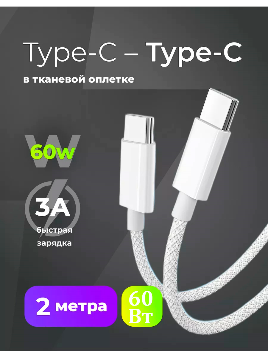 Кабель type-c to type-c 2 метра 60 Вт нейлон /Кабель для быстрой зарядки 2м интересное: