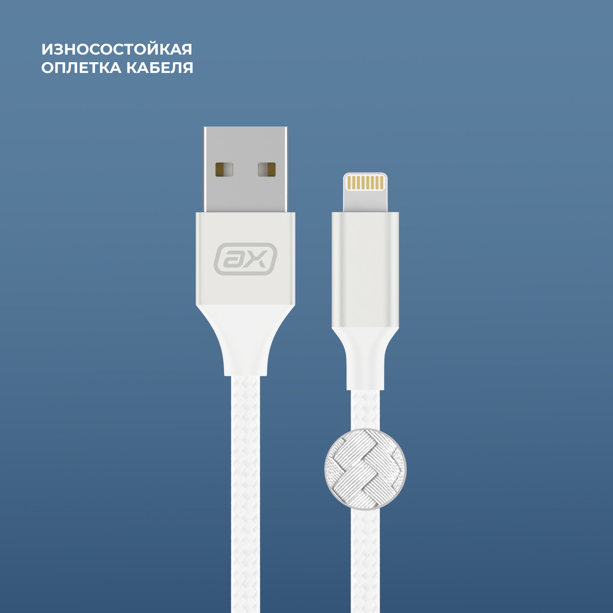 Купить Кабель для зарядки смартфона USB-A - Lightning, 2A, 1 м, белый, нейлон, ахха, 7263