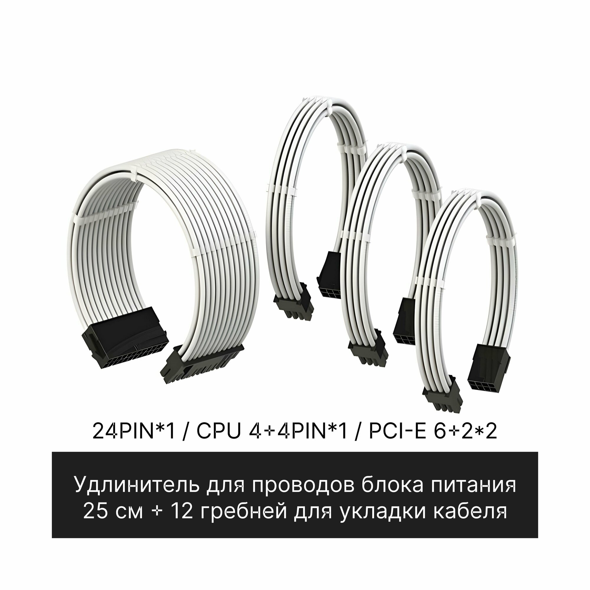 Купить Комплект кастомных удлинителей для блока питания 25 см белый 24 Pin, 4+4 pin, 6+2x2 PCI-E c гребенками