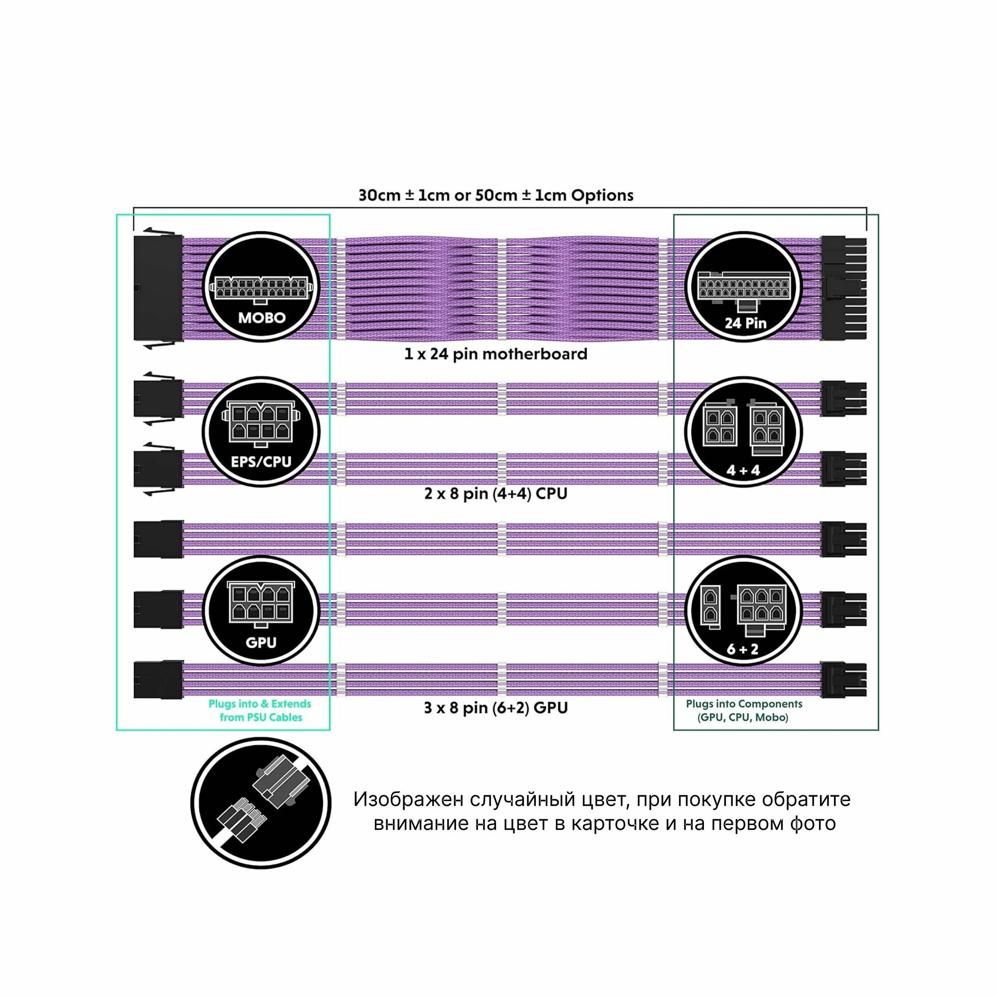 Комплект кастомных удлинителей для блока питания 30 см фиолетовый 24 Pin, 4+4 pin, 6+2x2 PCI-E c гребенками