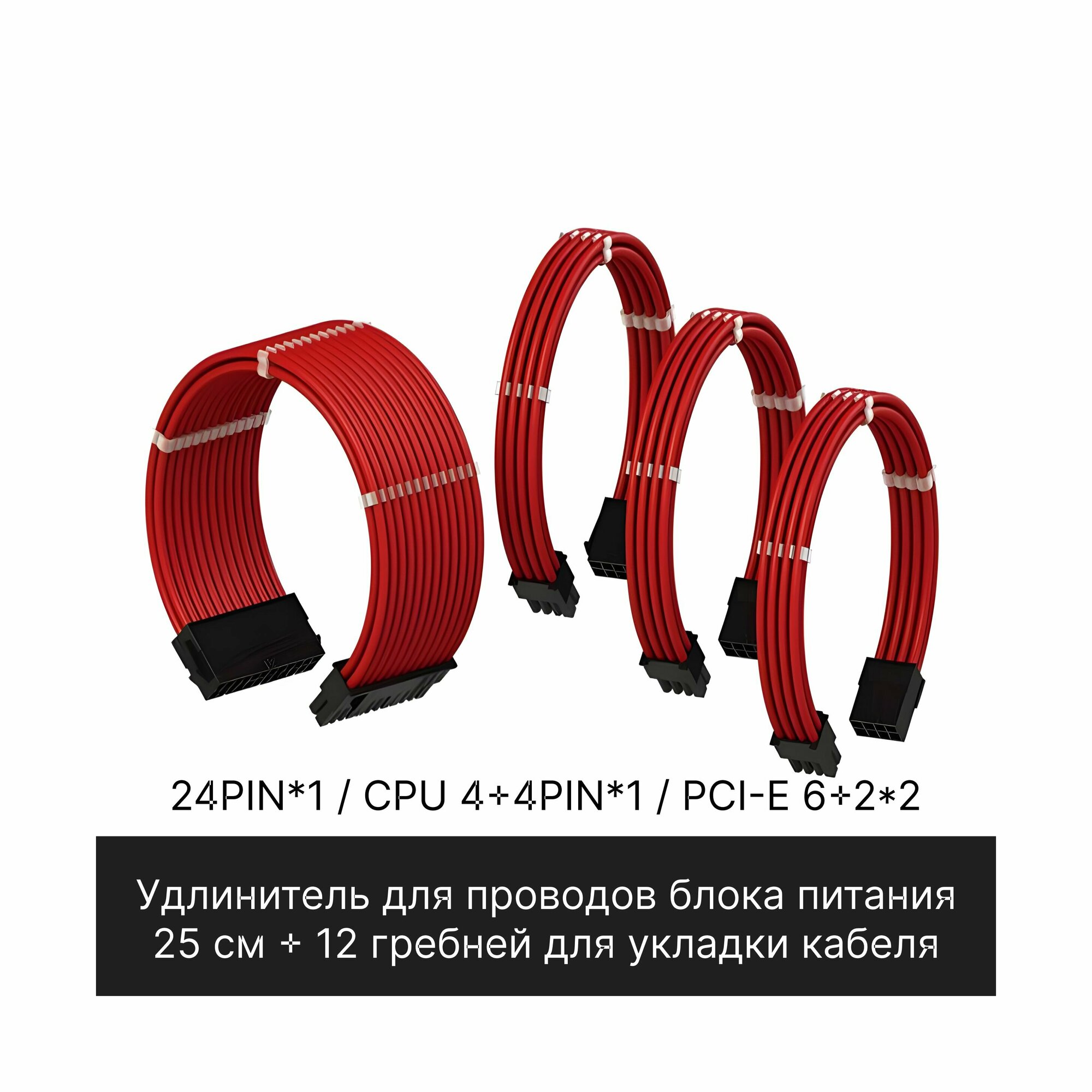 Купить Комплект кастомных удлинителей для блока питания 25 см красный 24 Pin, 4+4 pin, 6+2x2 PCI-E c гребенками