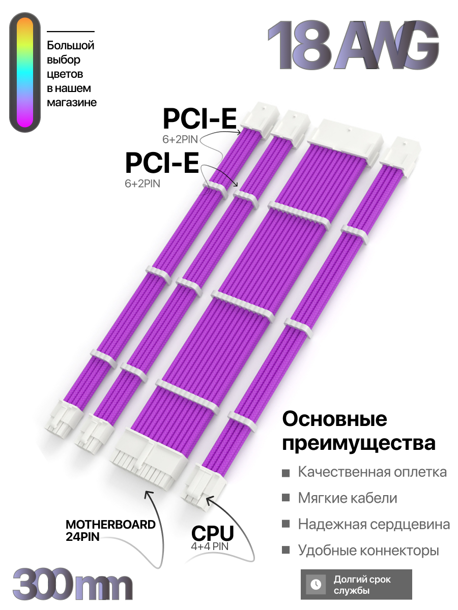 Ниже Вы можете прочитать отзывы на Комплект кастомных удлинителей для блока питания 30 см фиолетовый 24 Pin, 4+4 pin, 6+2x2 PCI-E c гребенками, ознакомится с подробными характеристиками, посмотреть интересные обзоры и фотографии на Комплект кастомных удлинителей для блока питания 30 см фиолетовый 24 Pin, 4+4 pin, 6+2x2 PCI-E c гребенками.