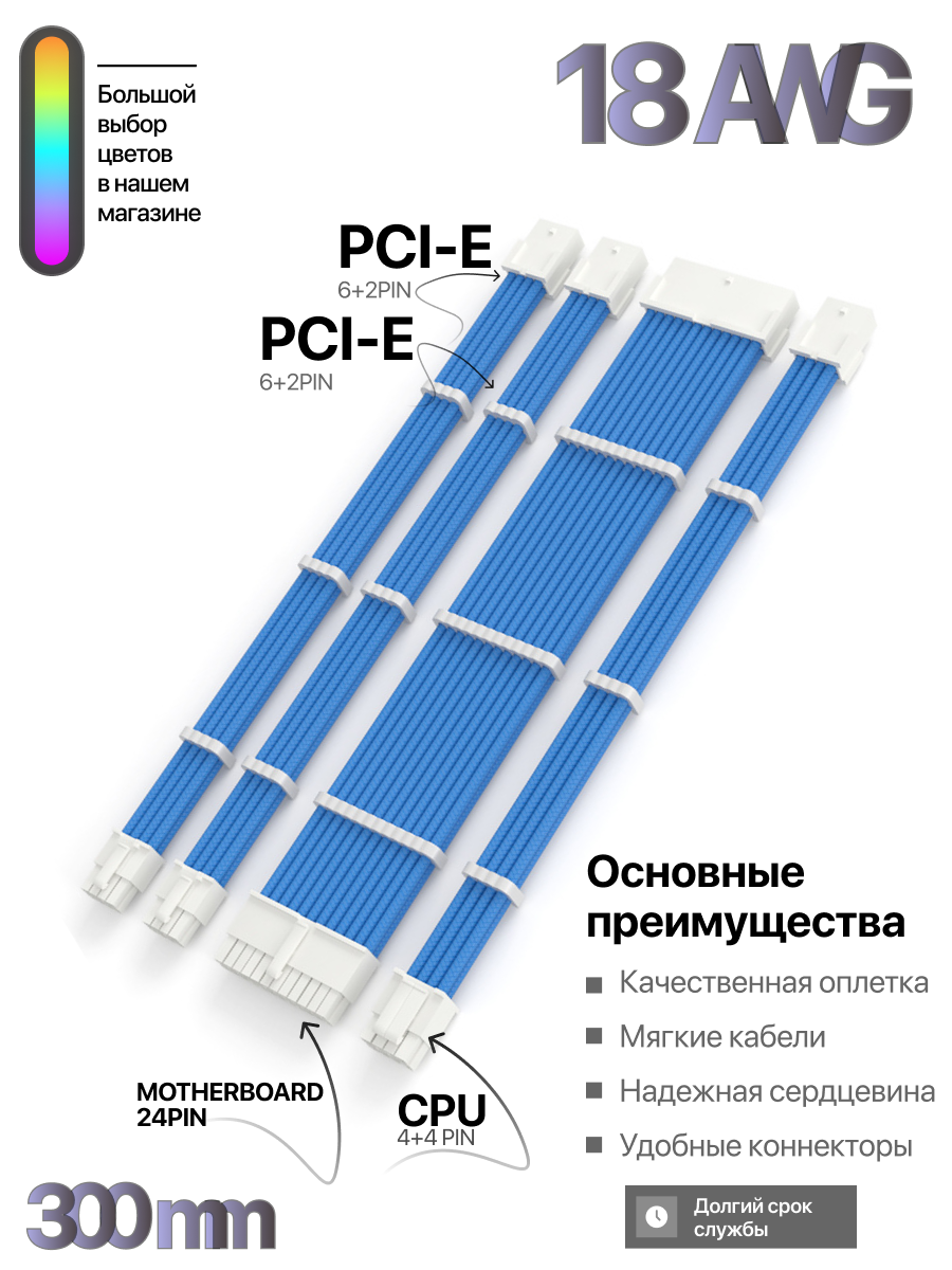 Купить Комплект кастомных удлинителей для блока питания 30 см синий 24 Pin, 4+4 pin, 6+2x2 PCI-E c гребенками