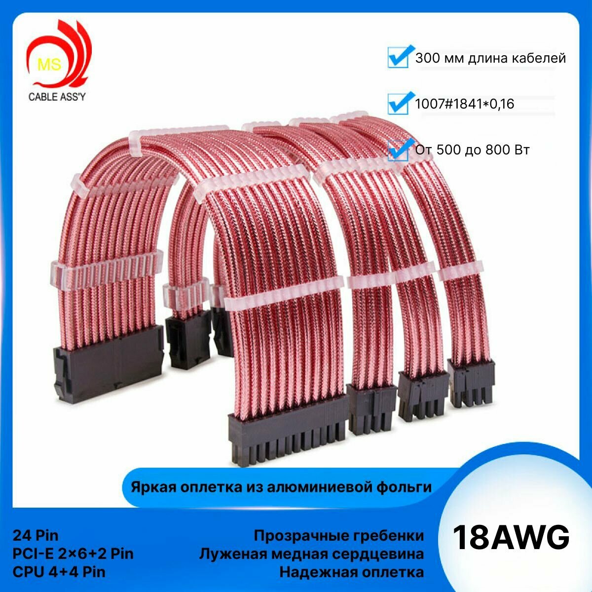 Комплект кастомных удлинителей для блока питания 30 см розовый 24 Pin, 4+4 pin, 6+2x2 PCI-E c гребенками