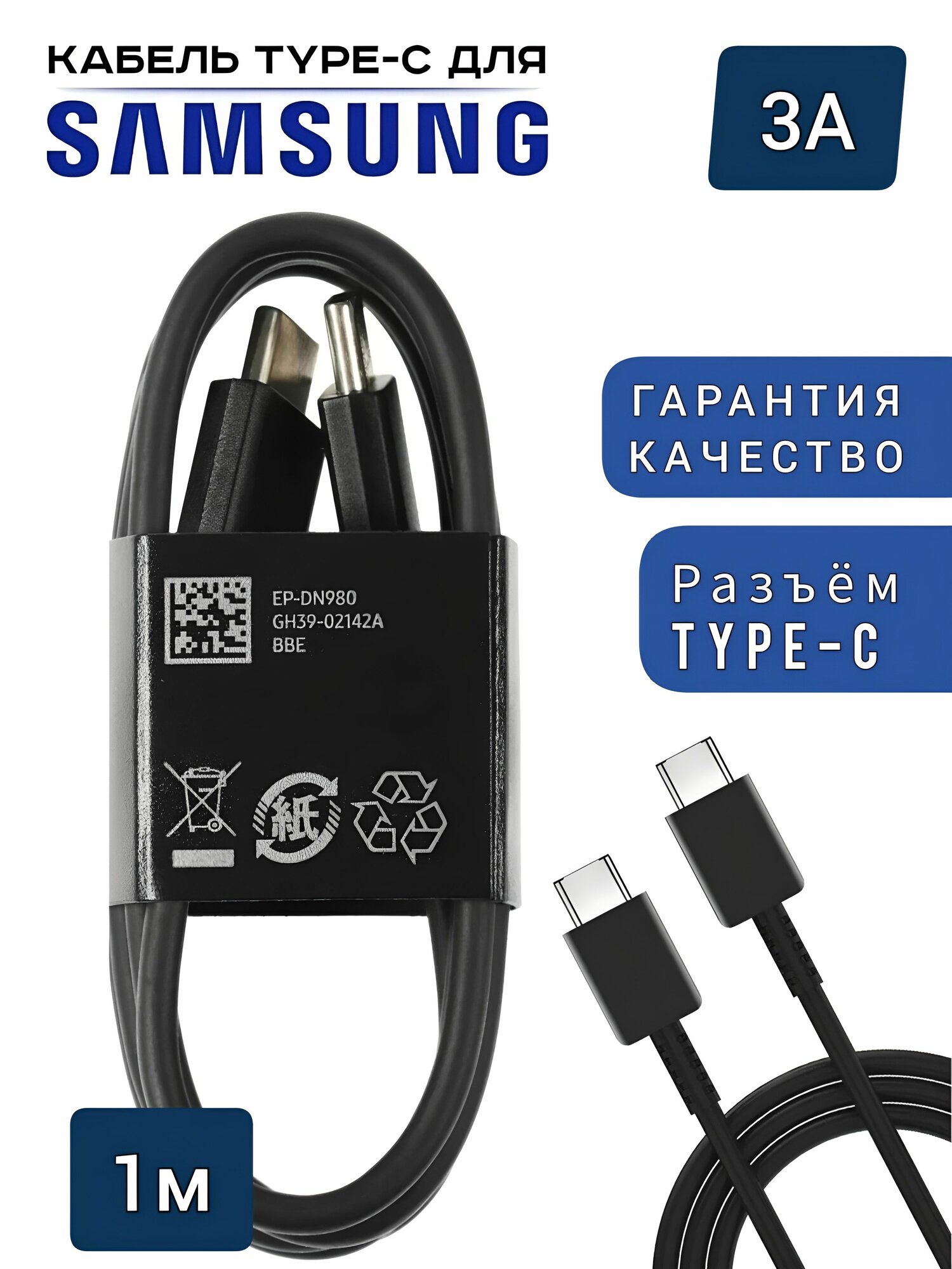 Купить Кабель Type-C Type-C для Samsung 1м.(3A) Тех-упаковка EP-DN980 Черный