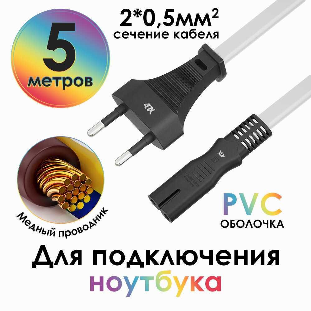Купить Кабель питания 220V плоская вилка - C7 восьмерка для аппаратуры 2x0,5 (4PH-FY-ST2) белый; черный 5.0м