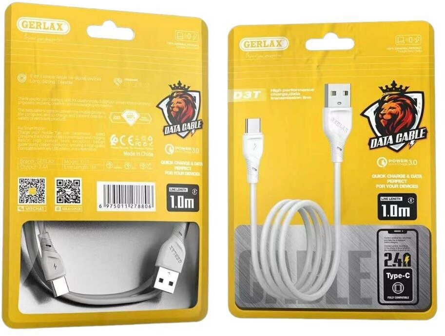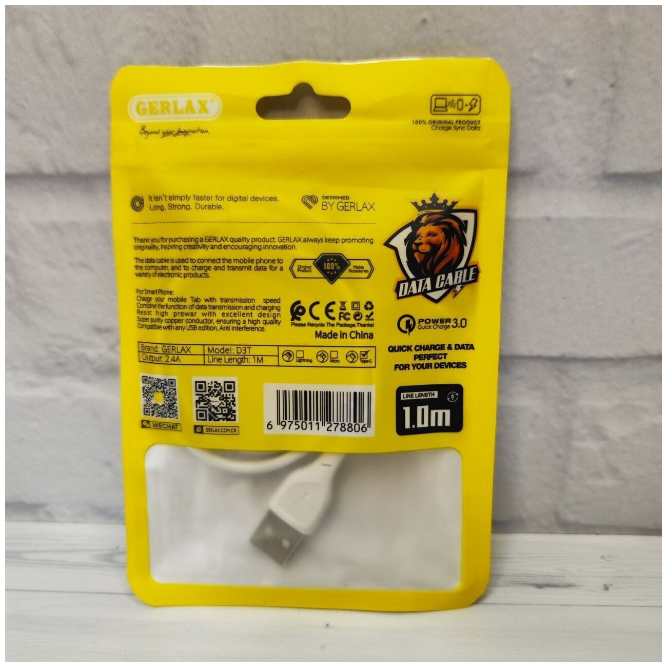 Купить Кабель GERLAX USB Type-C для зарядки телефона, быстрая зарядка провод type c шнур 1 метр белый