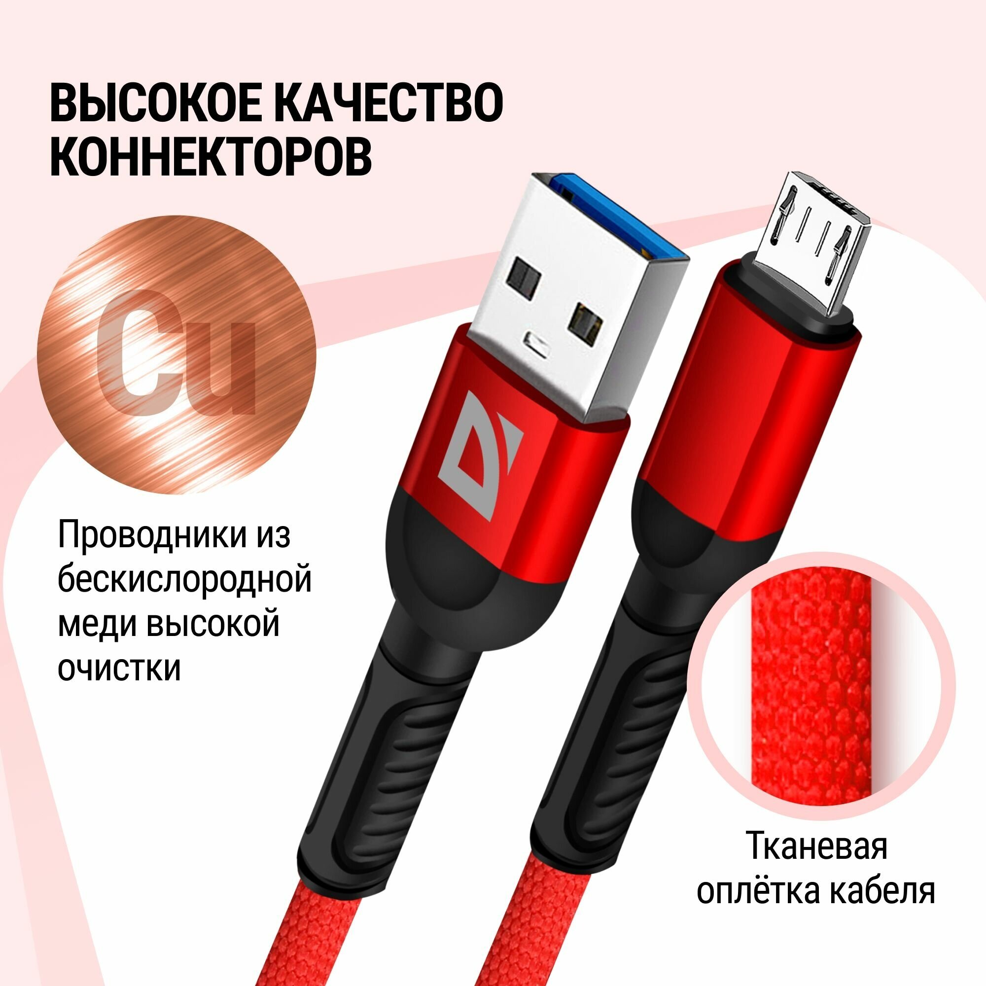 Купить USB кабель Defender F167 Micro красный, 1м, 2.4А, ткань, пакет