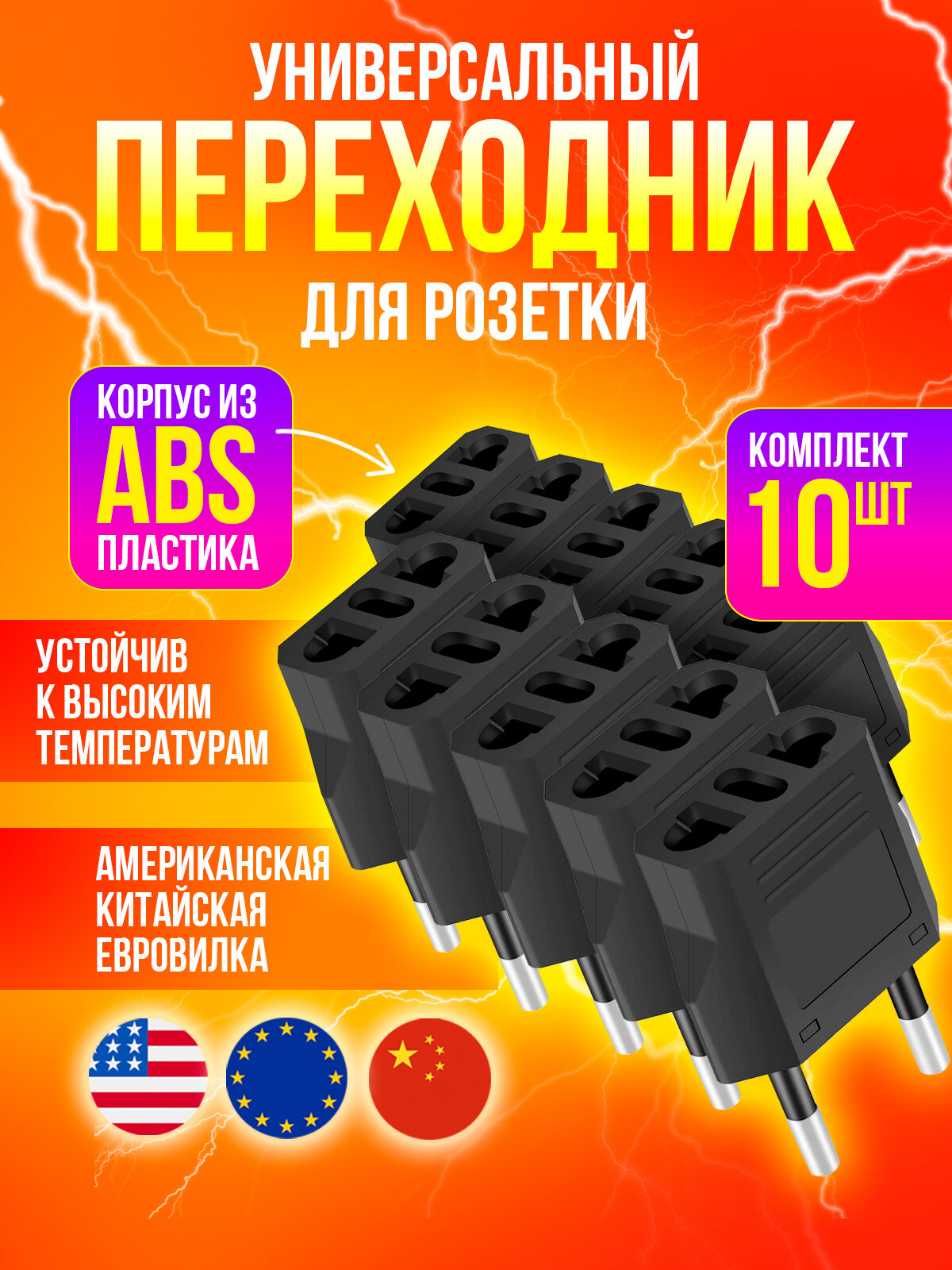 Купить Универсальный переходник для американской, китайской вилки US/CN, цвет Черный, 10 шт.