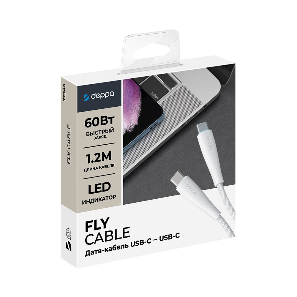 Кабель для зарядки смартфона Fly USB-С - USB-С, 60Вт, 1.2м, белый, Deppa, Deppa 72546 интересное: