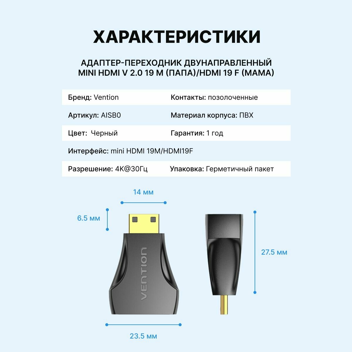 Адаптер переходник HDMI - mini HDMI 4К Vention переходник для фотоаппарата, планшета арт. AISB0 интересное: