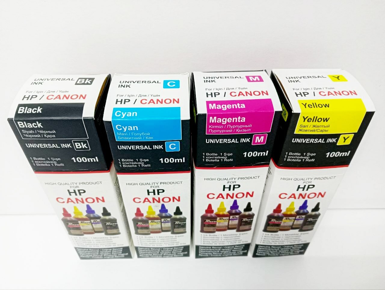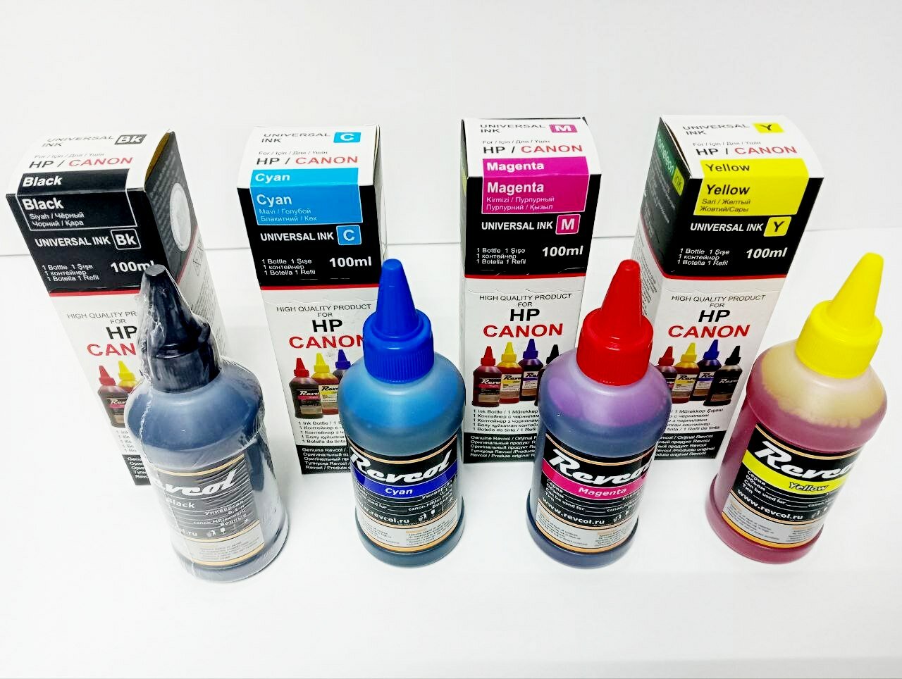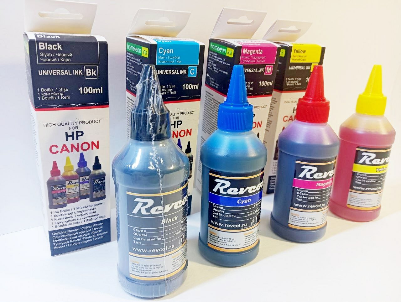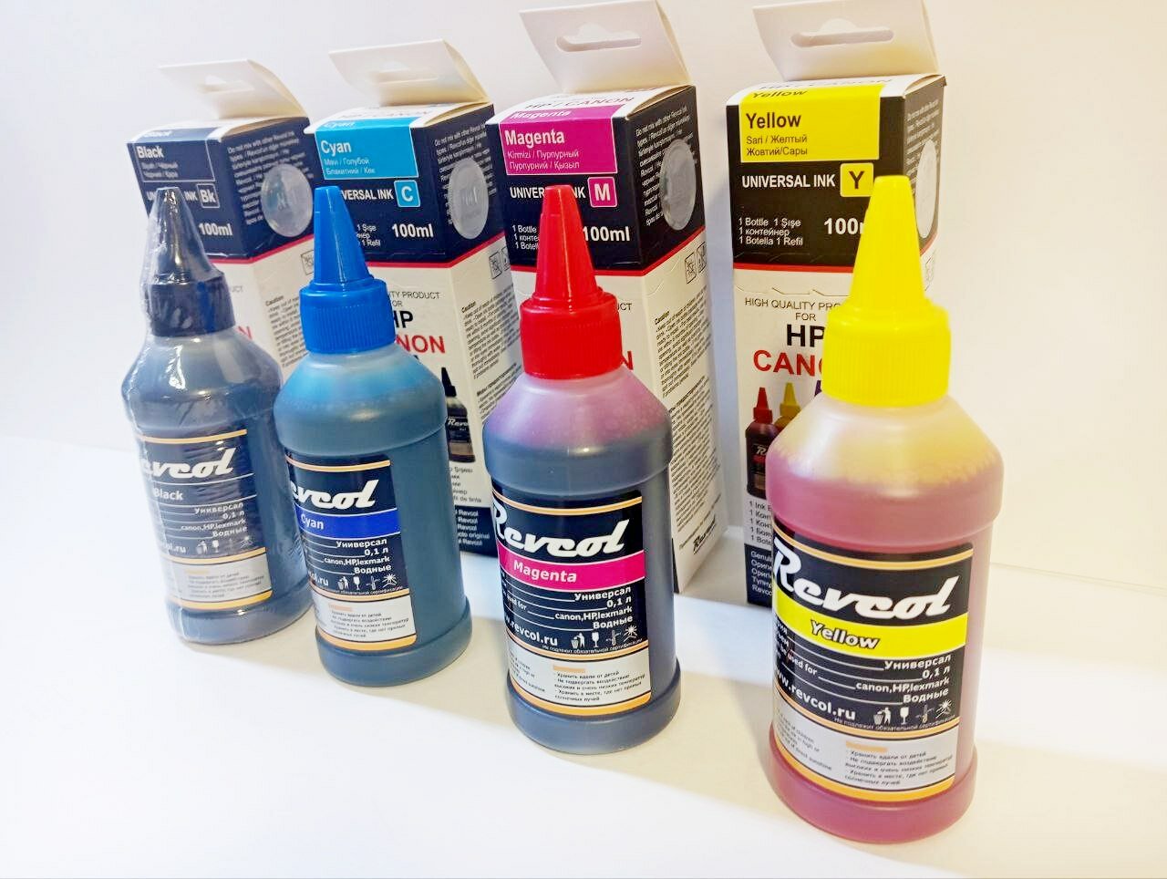 Купить Чернила Revcol универсальные для четырехцветных струйных принтеров HP и Canon CMYK, набор 4 цвета по 100 мл