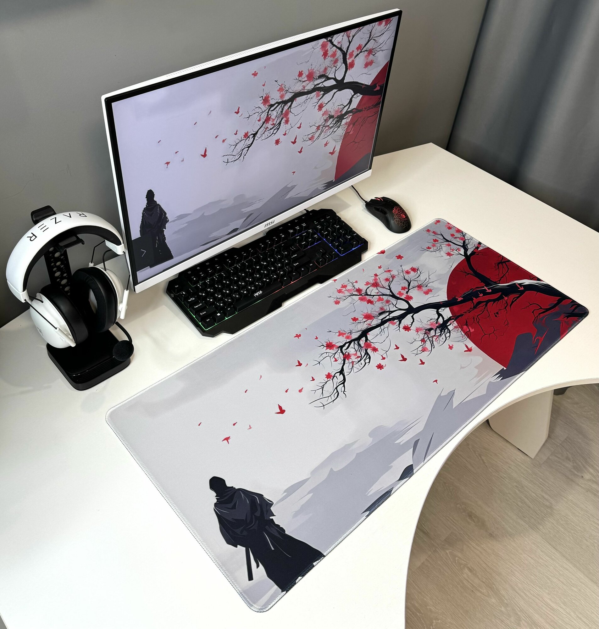 Купить Большой игровой коврик в японском стиле для мышки и клавиатуры 90х40 см, самурай и сакура, закат в Японии