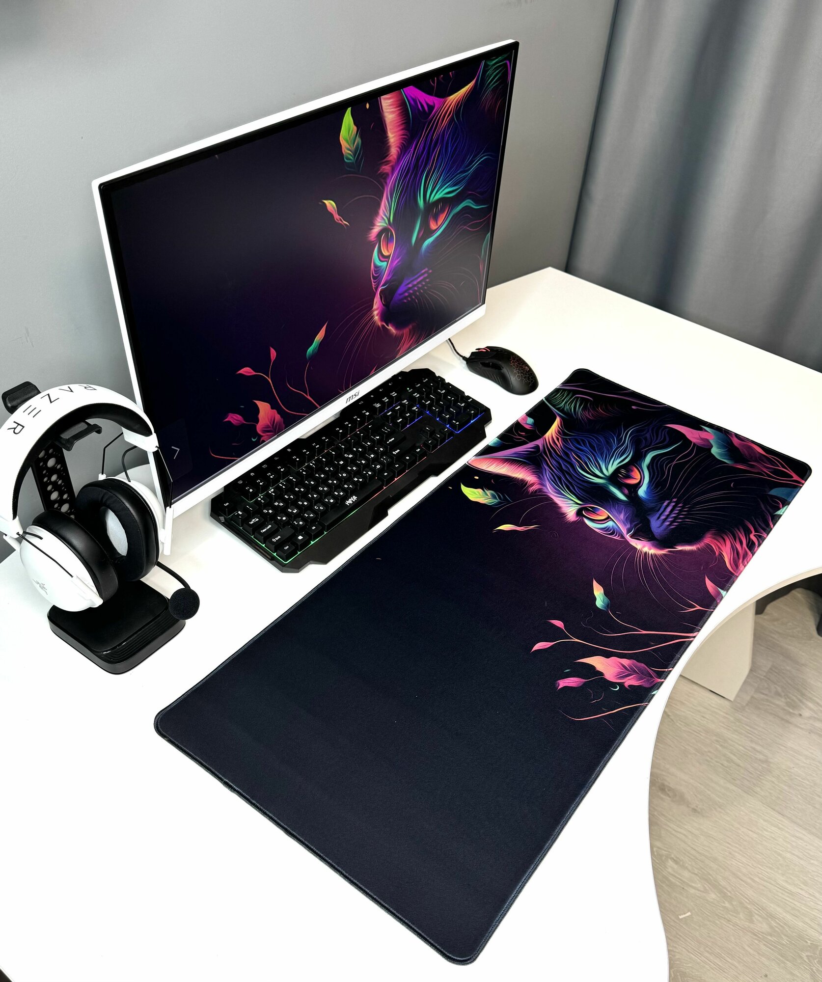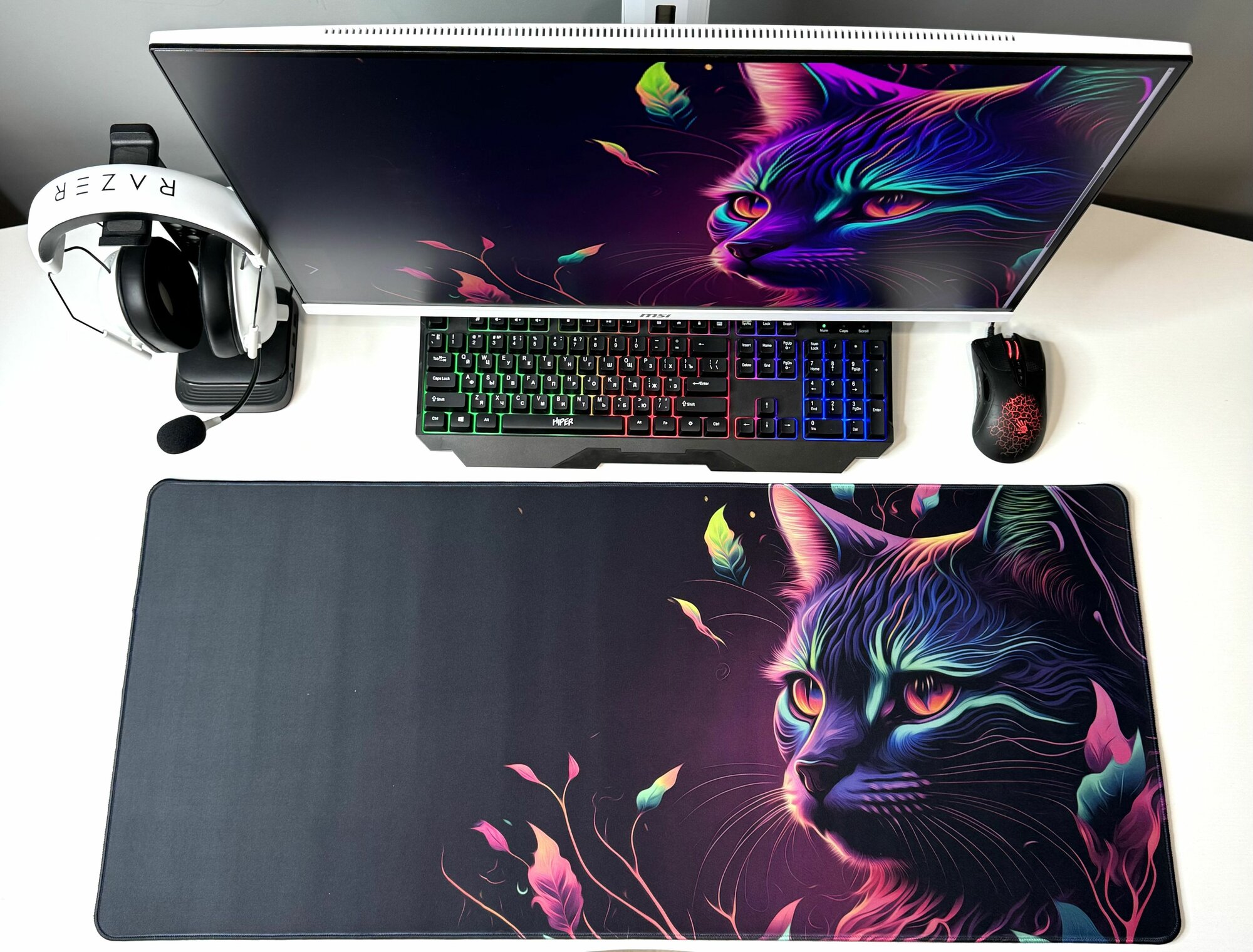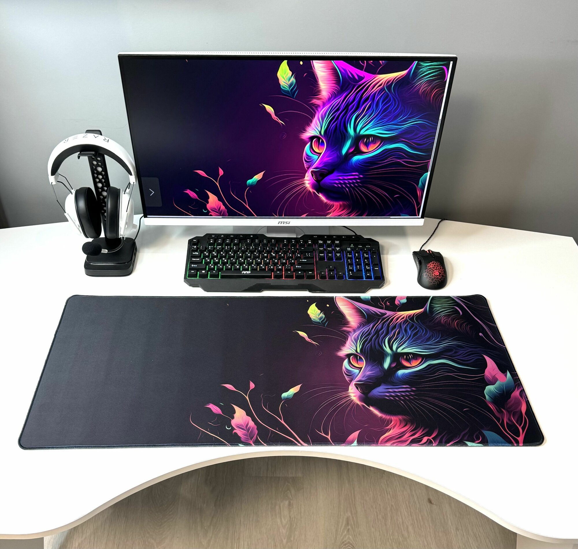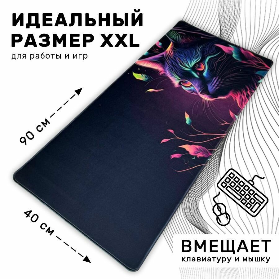 Купить Большой игровой коврик в японском стиле для мышки и клавиатуры 90х40 см, неоновая кошка