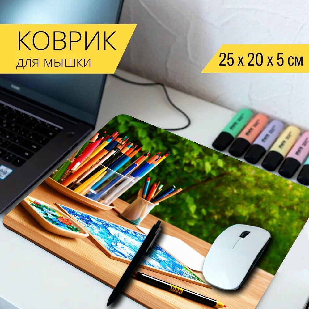 Коврик для мыши с принтом "Коричневый деревянный стол с инструментариями для рисования на фоне природы" 25x20см. интересное:
