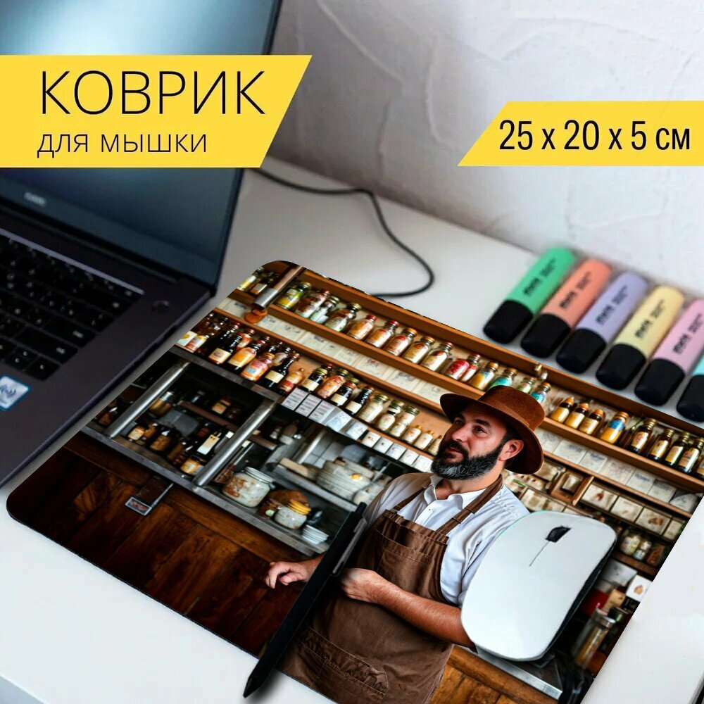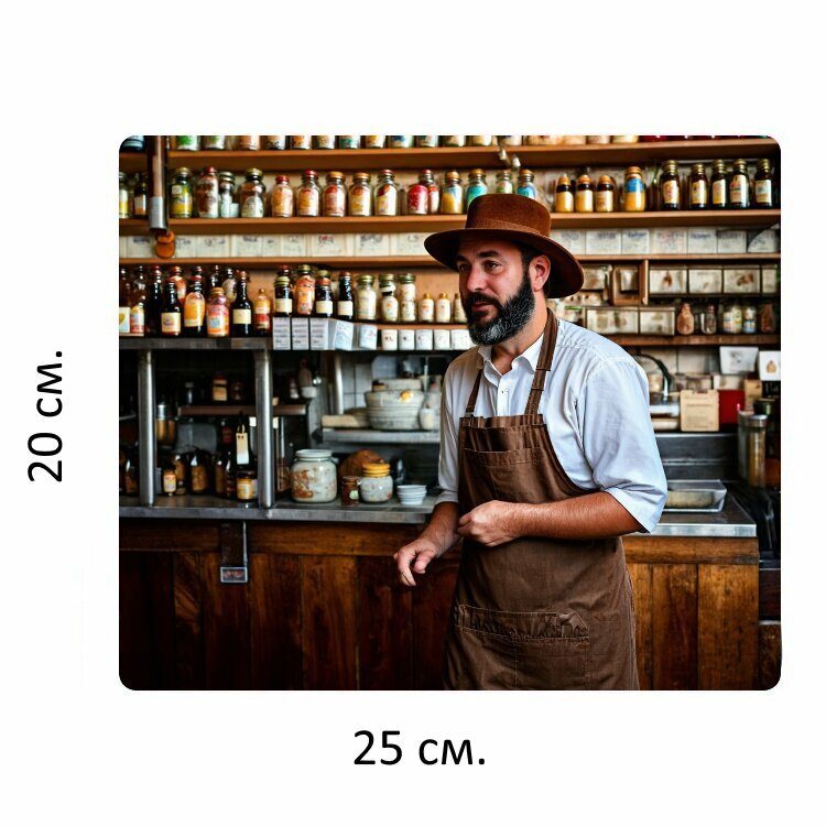 Коврик для мыши с принтом "Коричневый шляпник, стоящий в старом кафе, полный бутылок и банок" 25x20см. интересное: