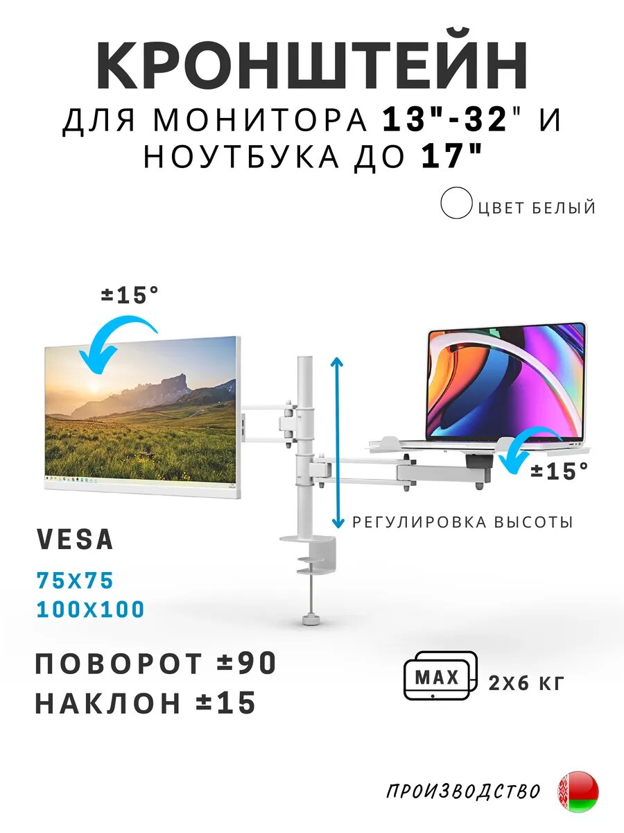 Кронштейн для монитора и ноутбука/планшета ElectricLight, настольный, VESA 75х75 и 100x100, белый интересное: