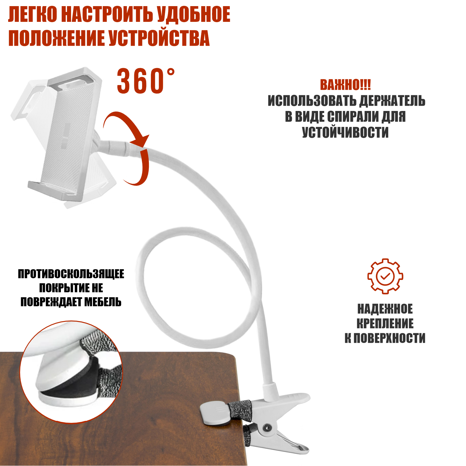 Гибкий держатель-прищепка для планшета до 25 см с металлическим зажимом для стола, белый интересное: