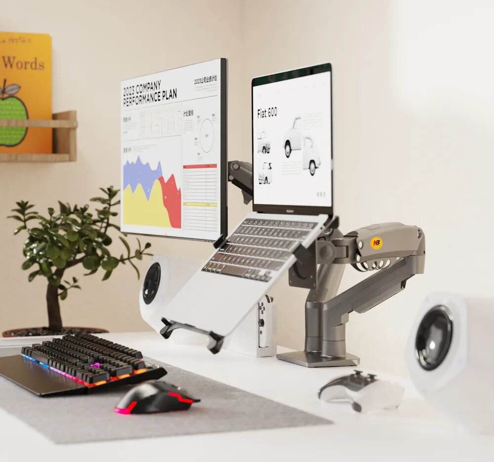 Настольный кронштейн для двух мониторов 17-27" с подставкой для ноутбука 10-17" North Bayou F160, белый