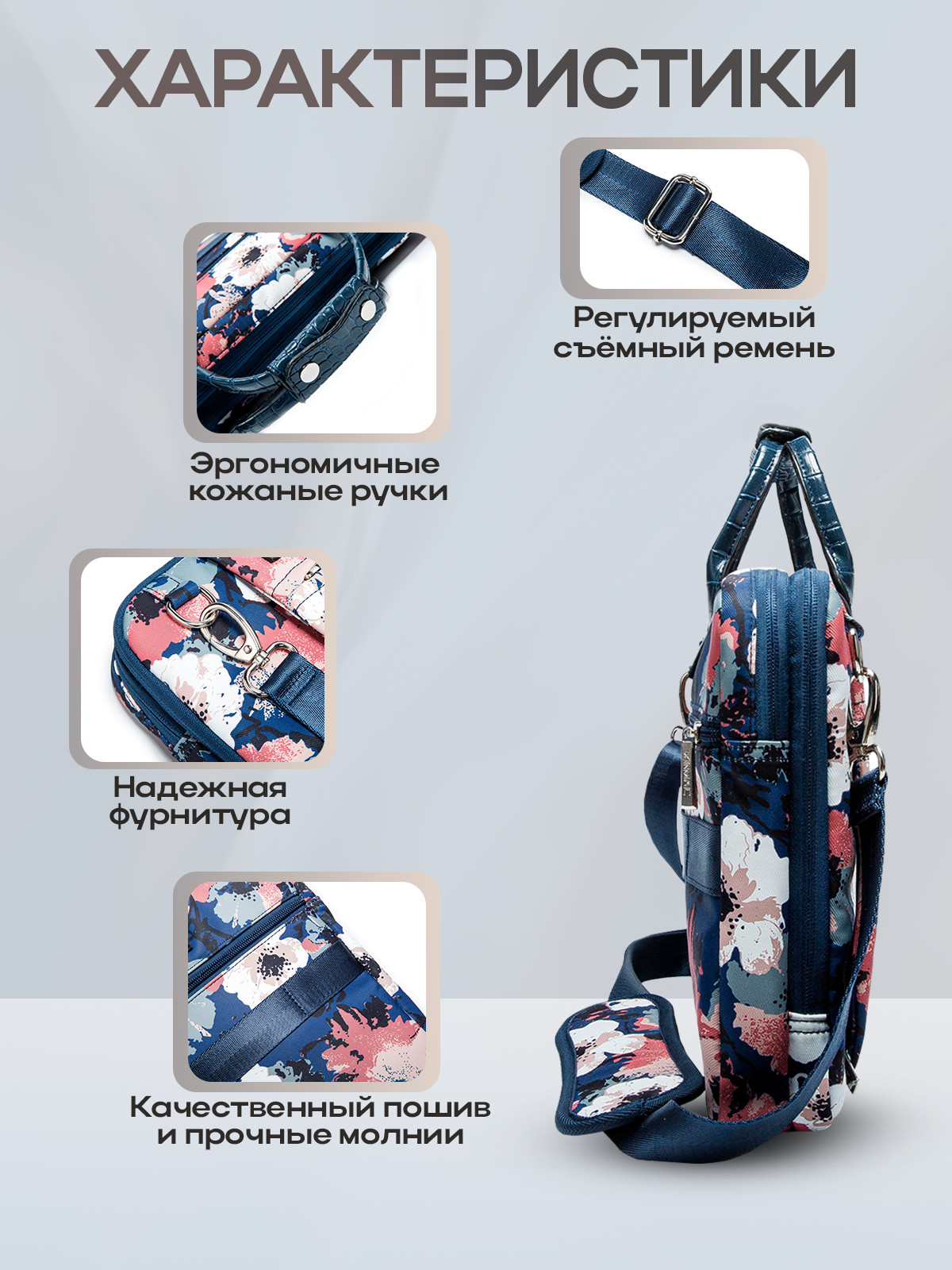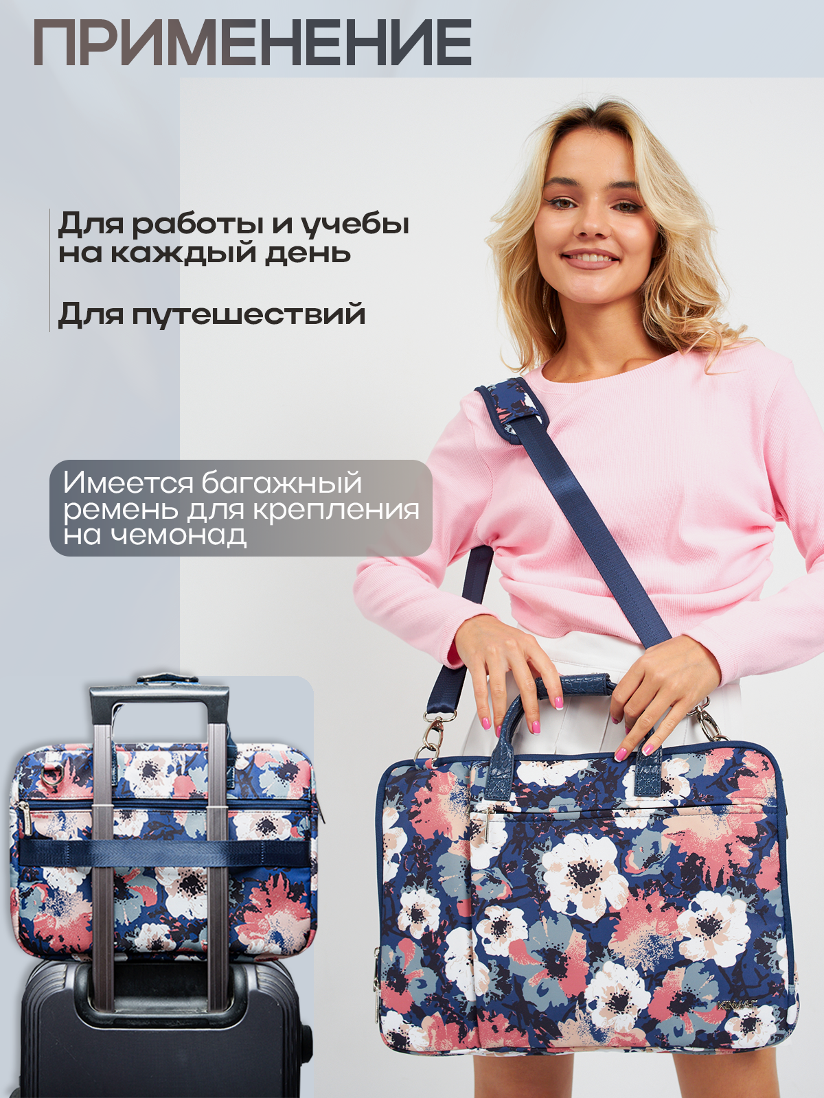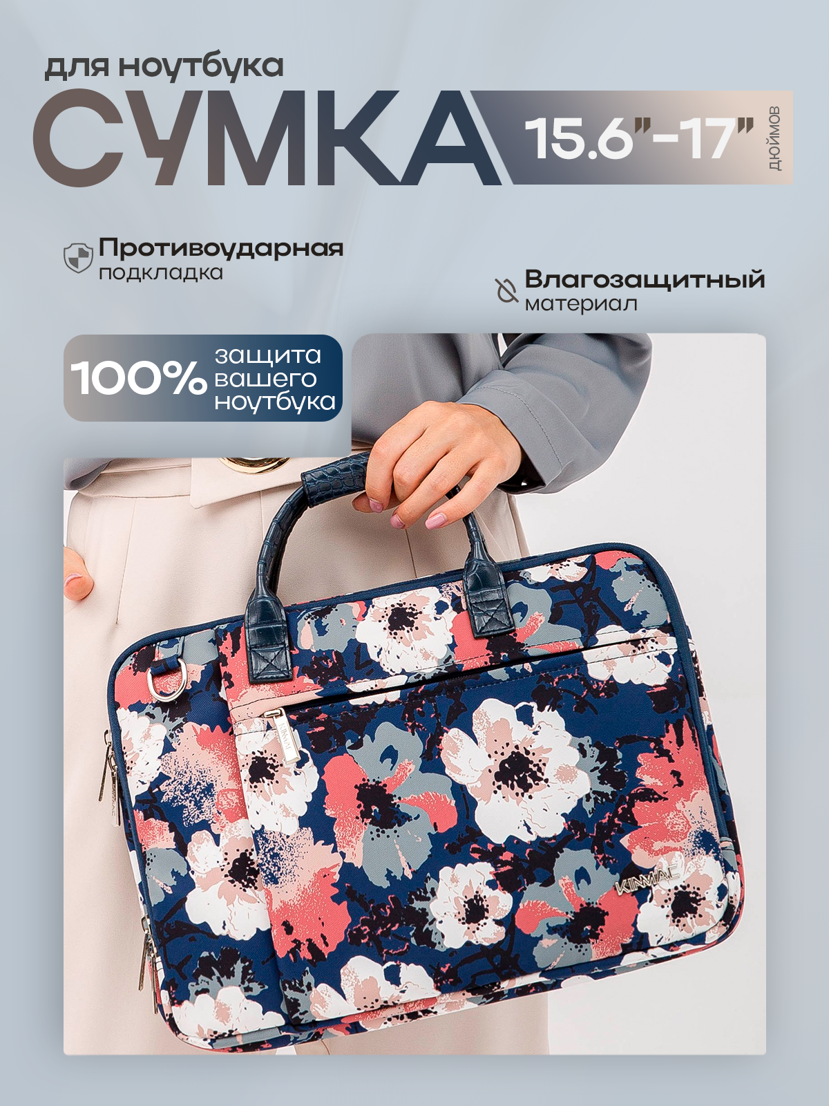 Сумка для ноутбука 15.6, 16 и 17 дюймов KINMAC с ремнем на плечо и множеством дополнительных кармашков (Цветы) интересное: