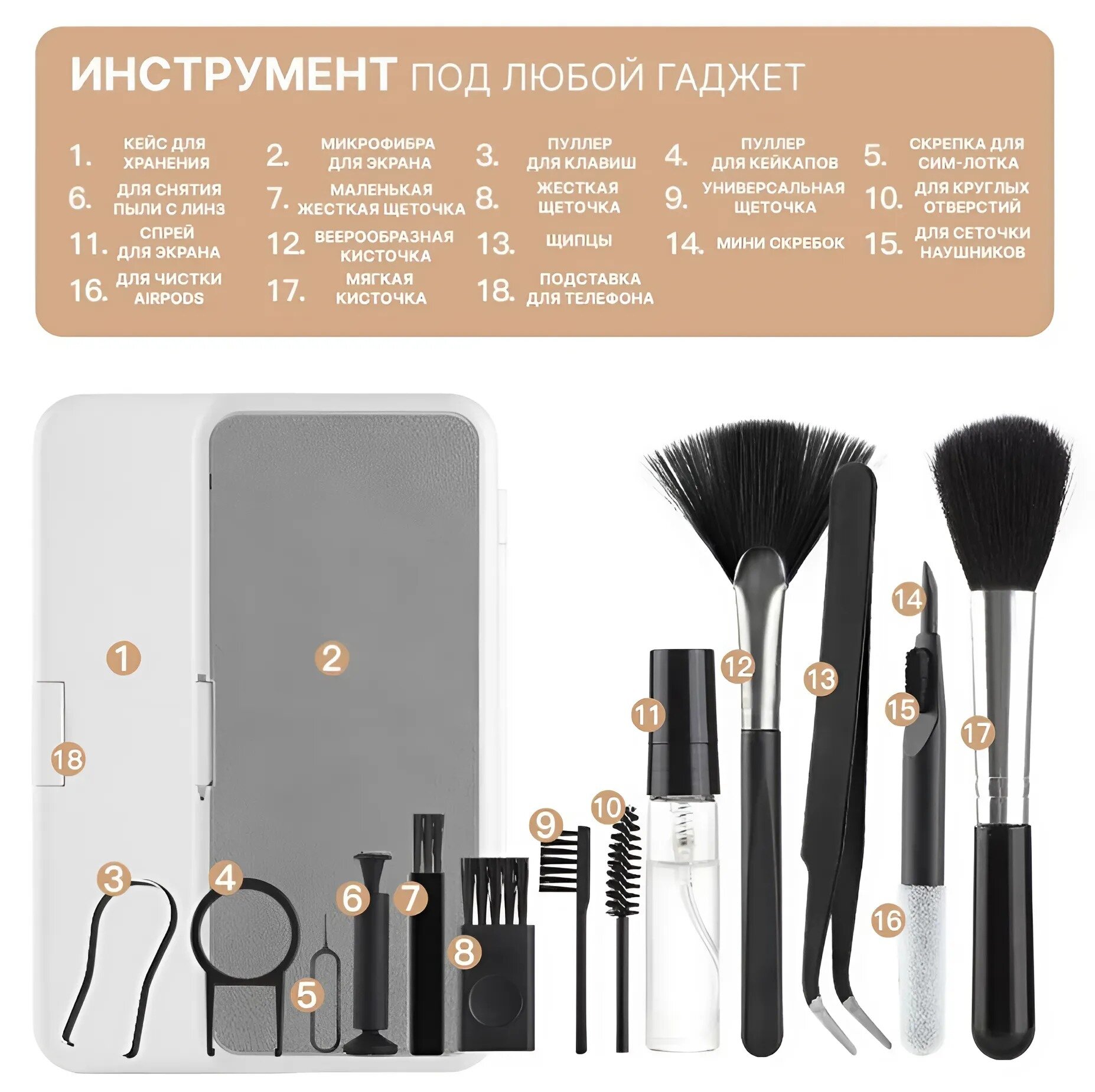 Универсальный набор для чистки гаджетов и аксессуаров 18 в 1 интересное: