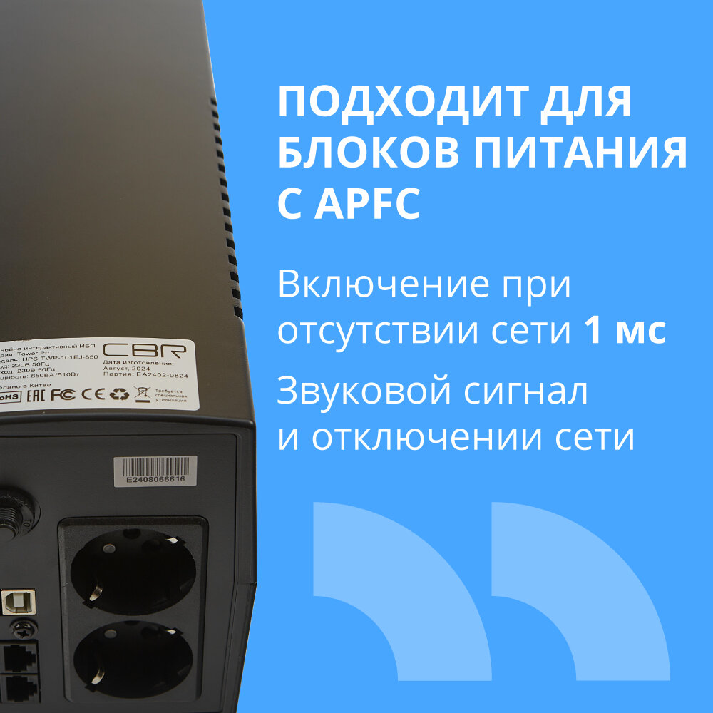 CBR Tech Источник бесперебойного питания CBR 850VA-510W, 2 розеток UPS-TWP-101EJ-850 интересное: