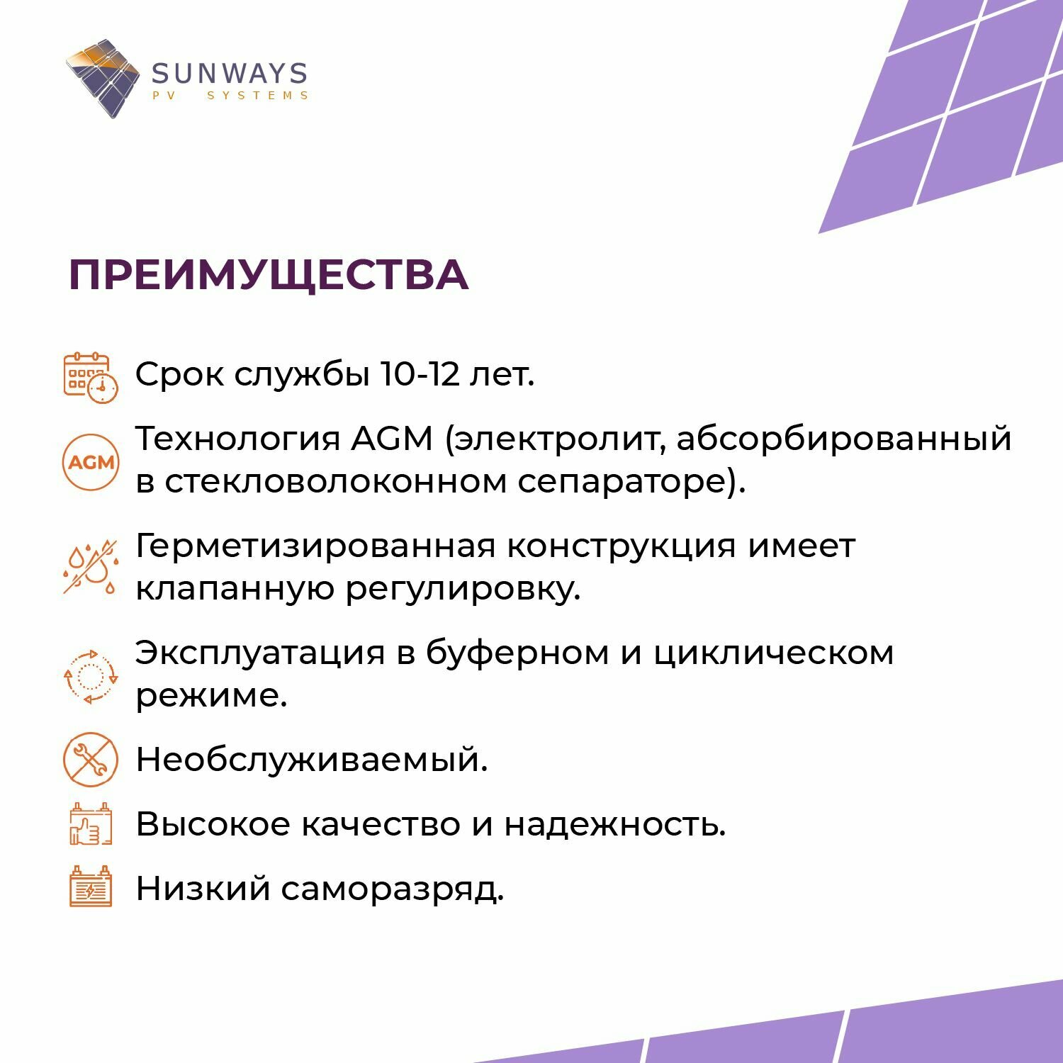 Аккумулятор SUNWAYS GP 12В 45Ач (12V 45Ah), тяговый аккумулятор, для ИБП, 1 шт