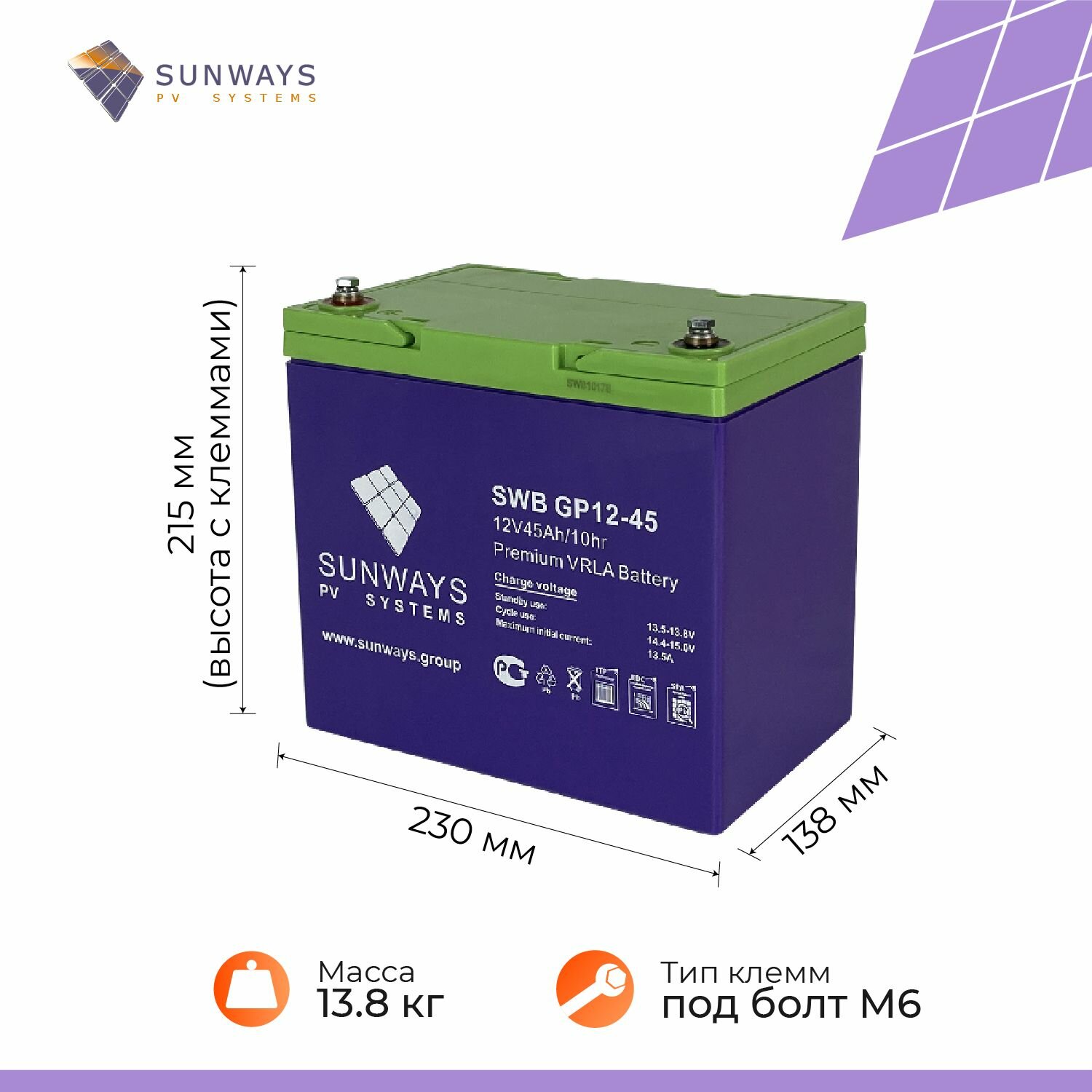 СохранитьАккумулятор SUNWAYS GP 12В 45Ач (12V 45Ah), тяговый аккумулятор, для ИБП, 1 шт интересное: