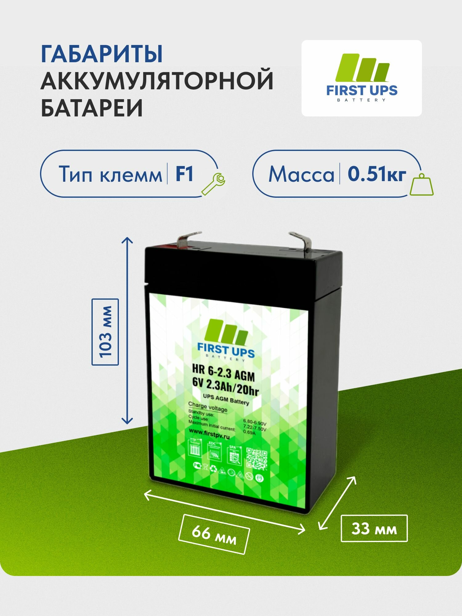 СохранитьАккумулятор FIRST UPS HR 6-2.3 AGM, 6 В, 2,3 Ач, 66x103x33 мм, 1 шт. интересное: