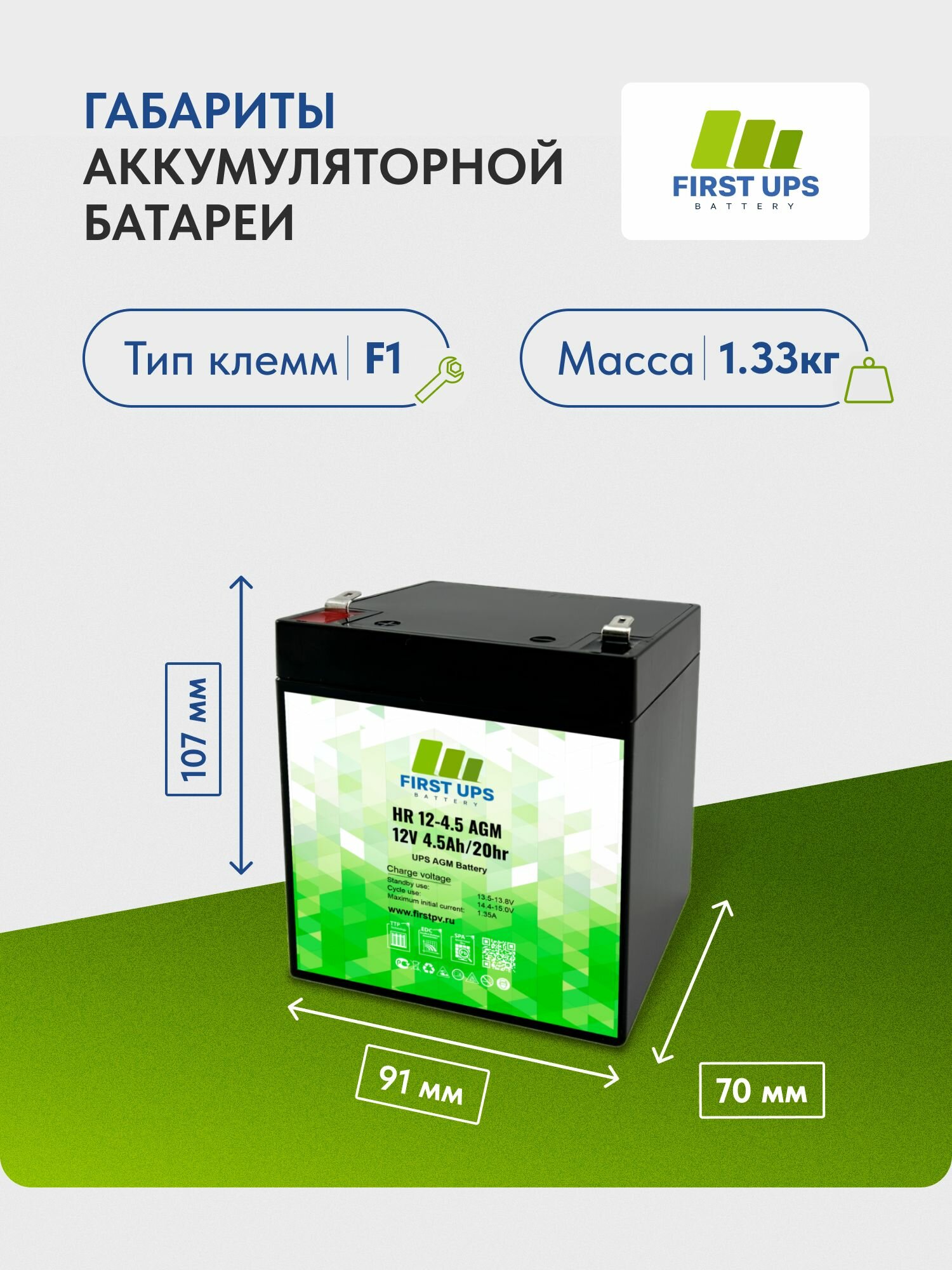 Купить Аккумулятор FIRST UPS HR 12-4.5 AGM, 12 В, 4,5 Ач, 91x107x70 мм, 1 шт.