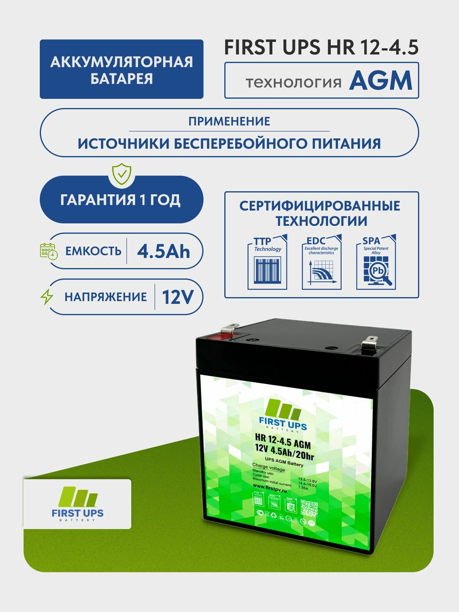 Аккумулятор FIRST UPS HR 12-12 AGM, 12 В, 12 Ач, 152x100x99 мм, 1 шт.
