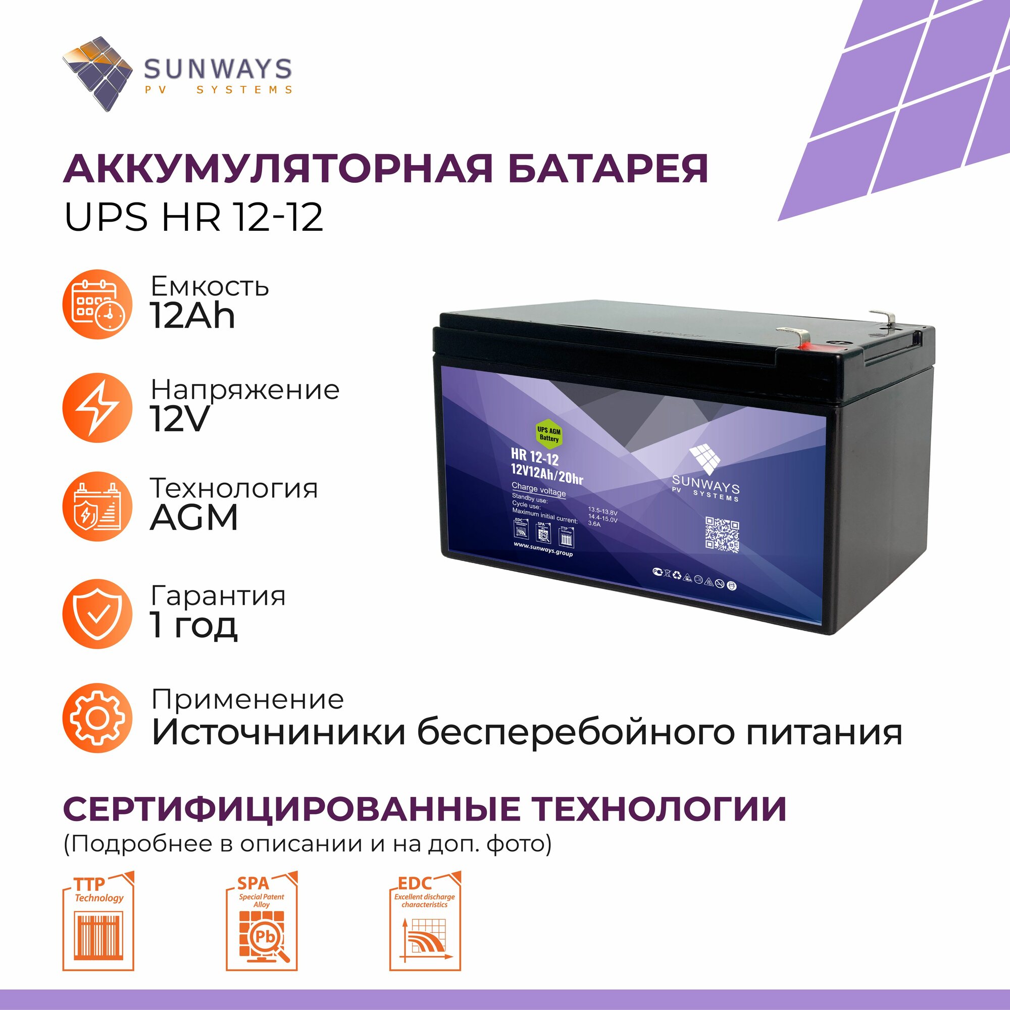 Купить Аккумулятор для ИБП SUNWAYS UPS HR 12В 12Ач (12V 12Ah), Аккумулятор для ИБП, 1 шт