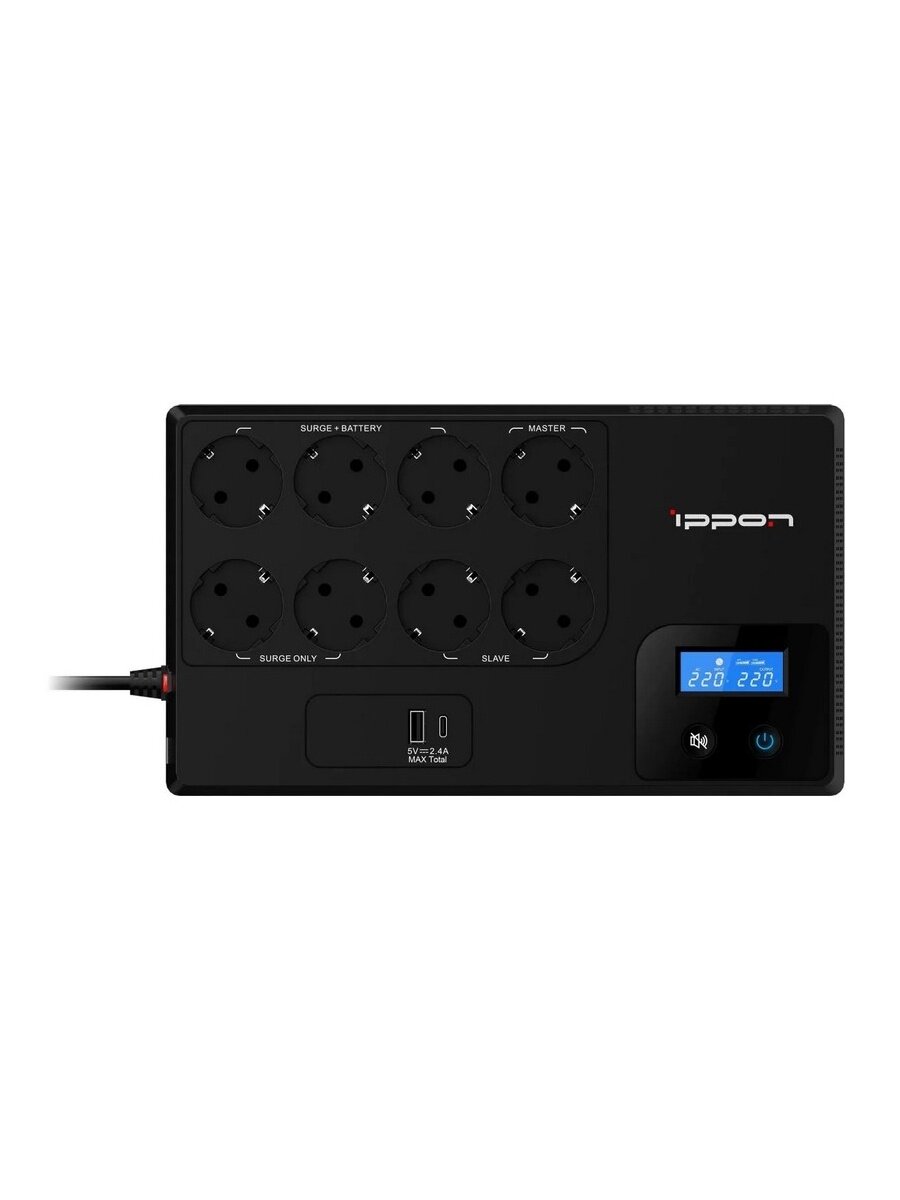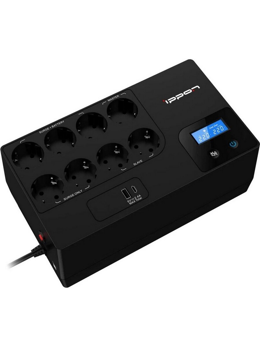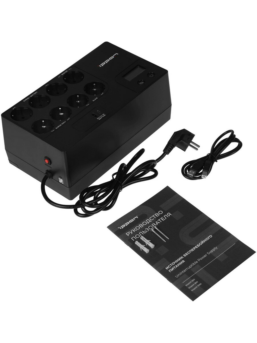 Купить ИБП IPPON Kirpich 850 black (линейно-интерактивный, 850VA, 480W, 6+2xEURO, USB, USB-зарядное устройство 5 В, 2.4 А (1А+1С)) (2003036)