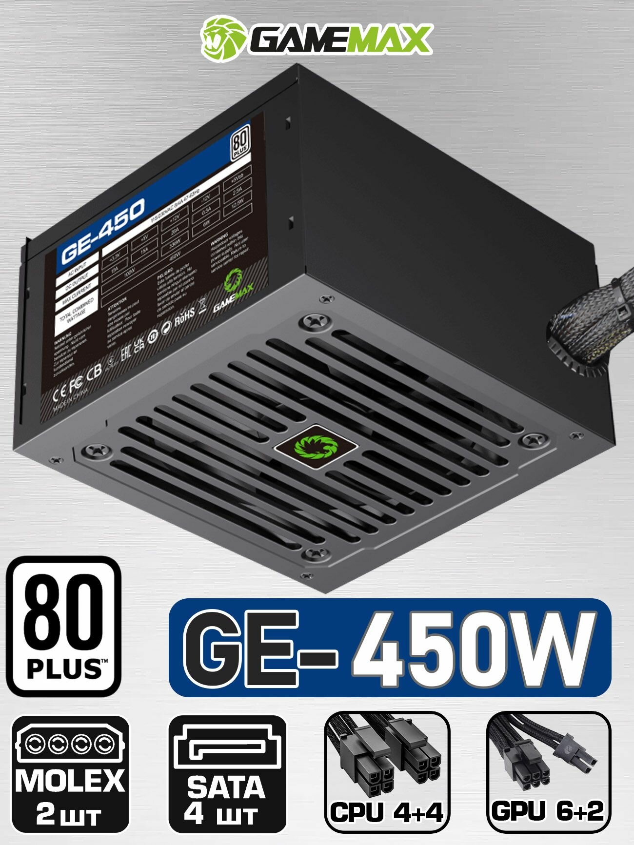 Купить Блок питания для ПК 450W GameMax GE-450 Черный 120мм 20+4pin 4+4pin(CPU) 1*6+2pin(PCI-E) 4*SATA 2*MOLEX