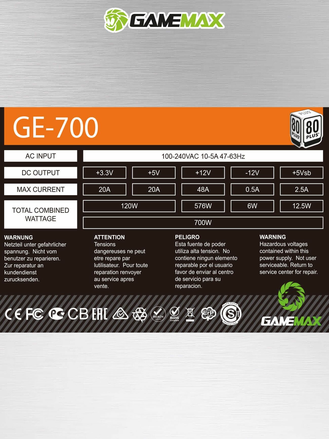 Блок питания для ПК 700W 80+ GameMax GE-700 Черный 120мм 20+4pin 4+4pin(CPU) 2*6+2pin(PCI-E) 5*SATA 3*MOLEX
