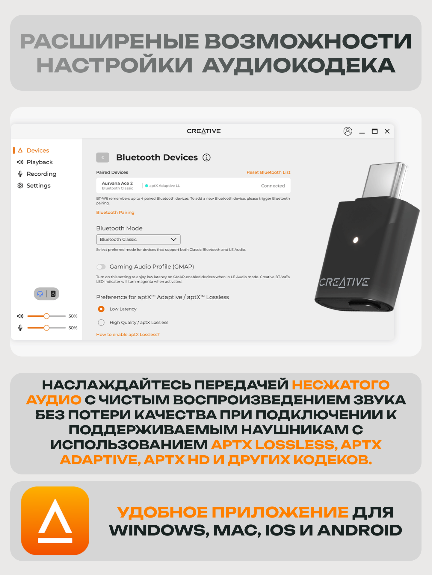 Купить Bluetooth-адаптер Creative "BT-W6", поддержка aptX, 24 бита, 96кГц