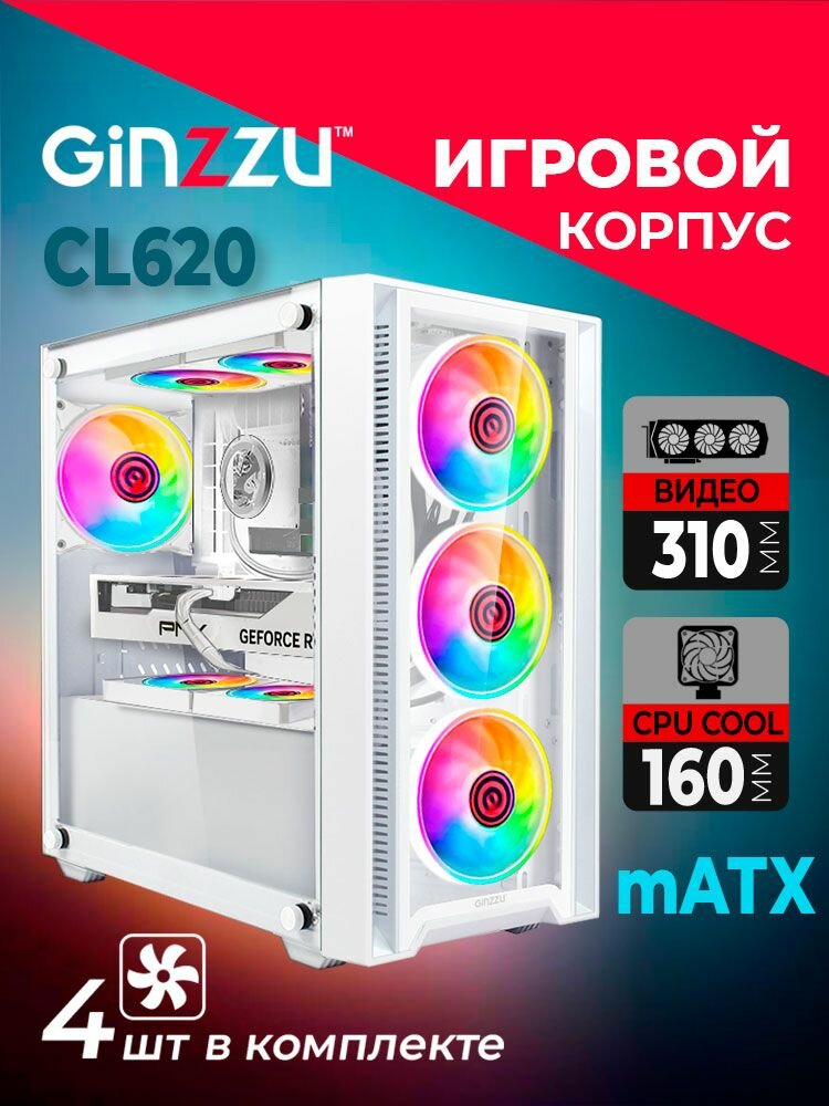 Корпус Ginzzu CL620 mATX 4*12см FAN, закаленное стекло боковая и передняя панель интересное: