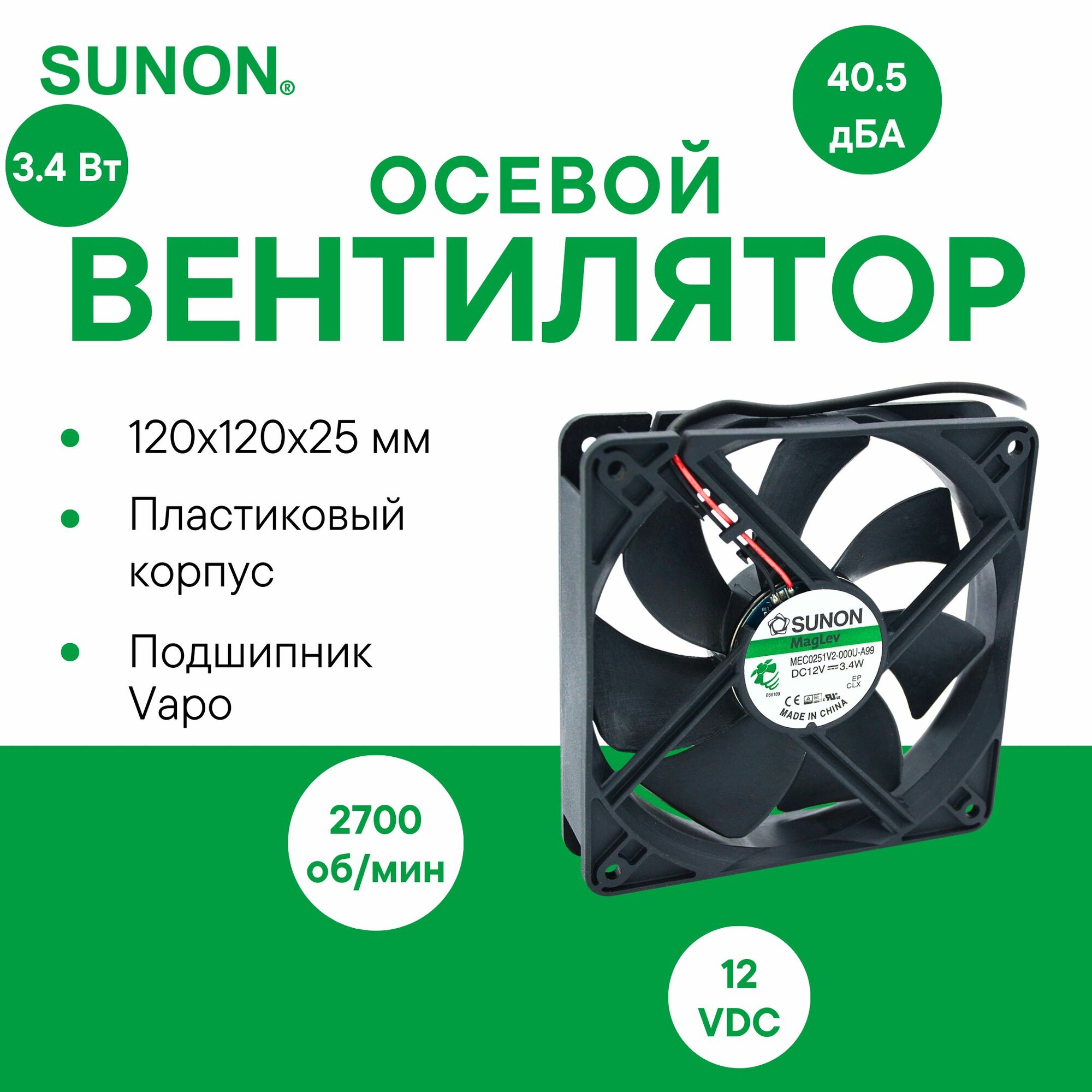 SUNON MEC0251V2-000U-A99 осевой вентилятор с подшипником Vapo, 120х120х25мм, 12VDC, 3.4Вт, 93CFM, 2700об/мин, 2 провода, расчетный срок службы 60000 часов интересное: