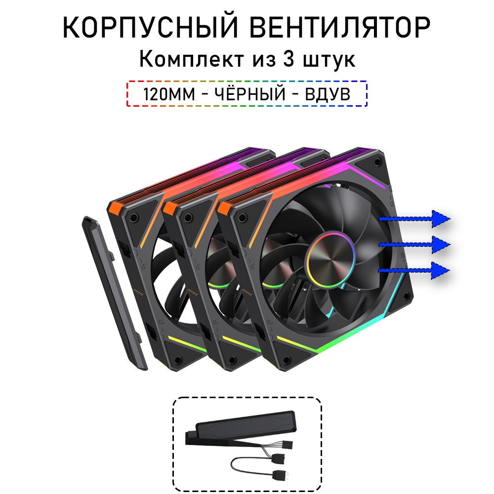 Модульный вентилятор - 5RS Inline - 120мм, A-RGB, PWM+5v3, Комплект из 3 штук, чёрный, на выдув из корпуса