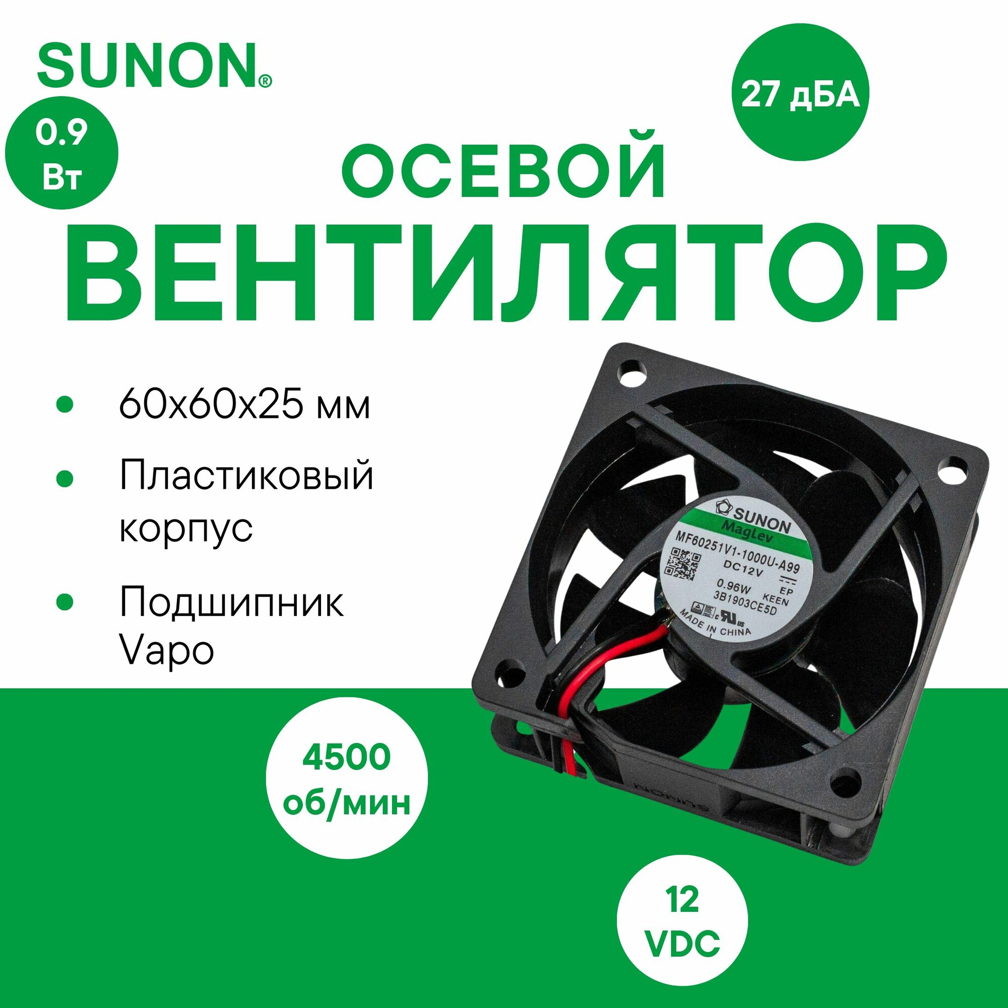 SUNON MF60251V1-1000U-A99 осевой вентилятор с подшипником Vapo, 60х60х25мм, 12VDC, 0.9Вт, 23.5CFM, 4500об/мин, 2 провода, расчетный срок службы 70000 часов интересное: