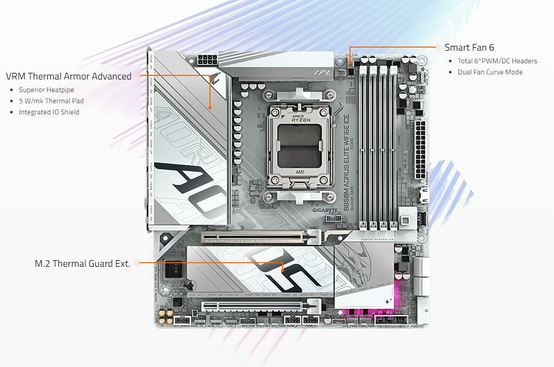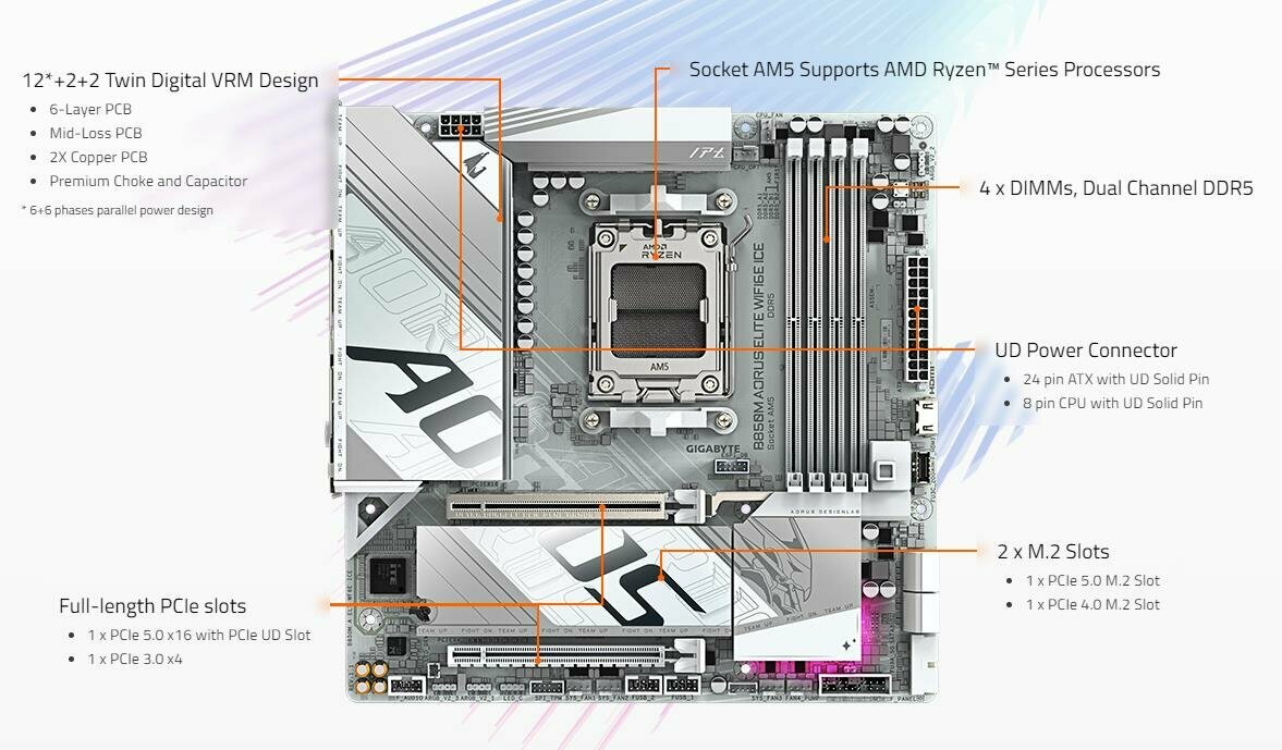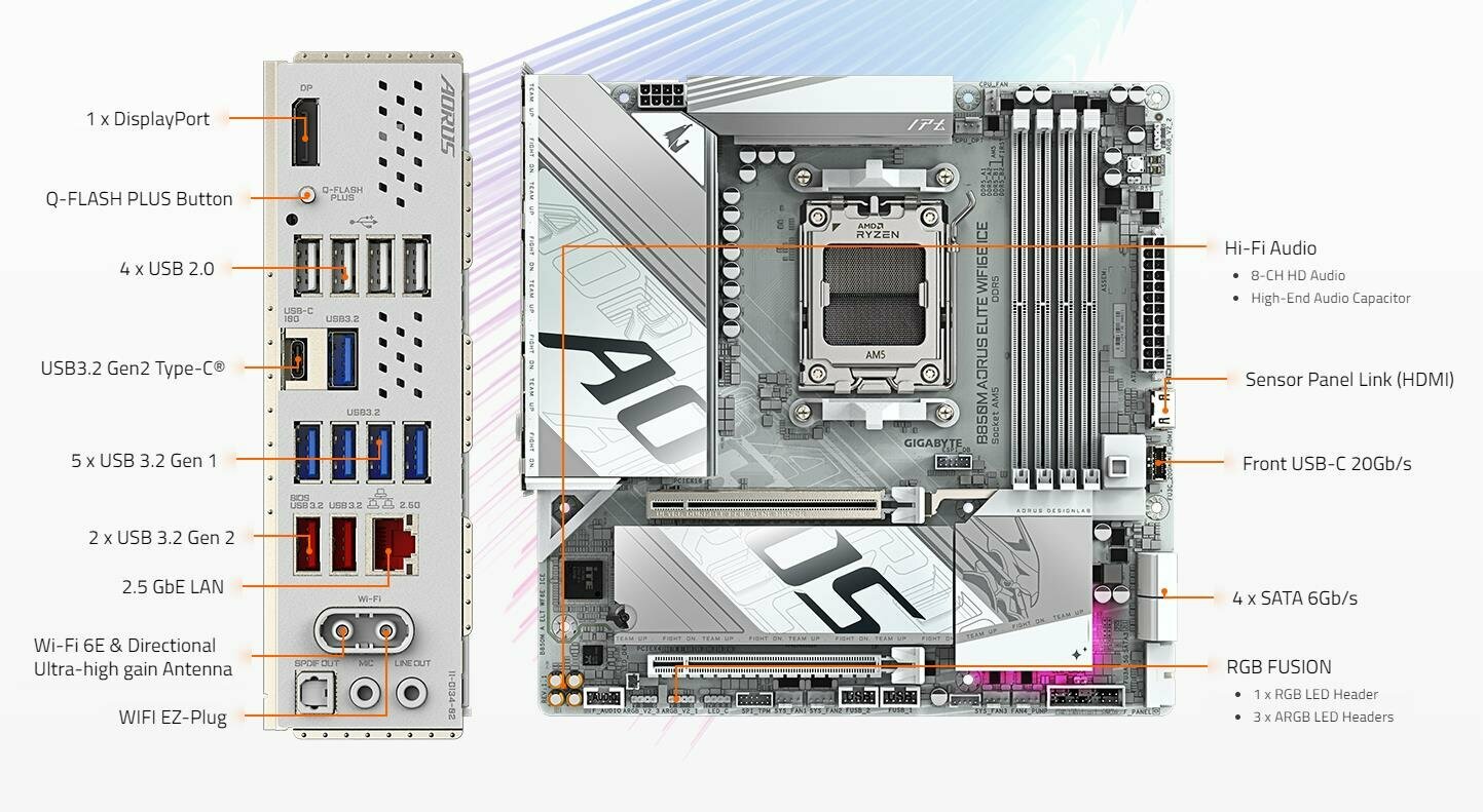 Материнская плата Gigabyte B850M AORUS ELITE ICE, Micro ATX,4*64GB DDR5,8200MTs/2*M.2 SSD,4*SATA6/WIFI6E/Bluetooth5.3, CN интересное: