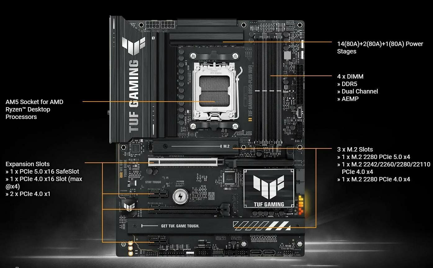 Ниже Вы можете прочитать отзывы на Материнская плата ASUS TUF GAMING B850M-PLUS WIFI, mATX(24.4*24.4cm), 4* DDR5-64GB, 8000MTs/3*M.2 SSD,4 SATA 6G./WIFI 6E, Bluetooth v5.4/Realtek 7.1/Версия CN, ознакомится с подробными характеристиками, посмотреть интересные обзоры и фотографии на Материнская плата ASUS TUF GAMING B850M-PLUS WIFI, mATX(24.4*24.4cm), 4* DDR5-64GB, 8000MTs/3*M.2 SSD,4 SATA 6G./WIFI 6E, Bluetooth v5.4/Realtek 7.1/Версия CN.