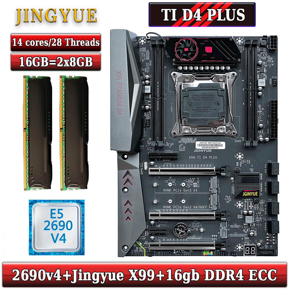 Комплект материнская плата Jingyue X99 Titanium D4 + Xeon 2690V4 + 16GB DDR4 ECC 2x8GB Red