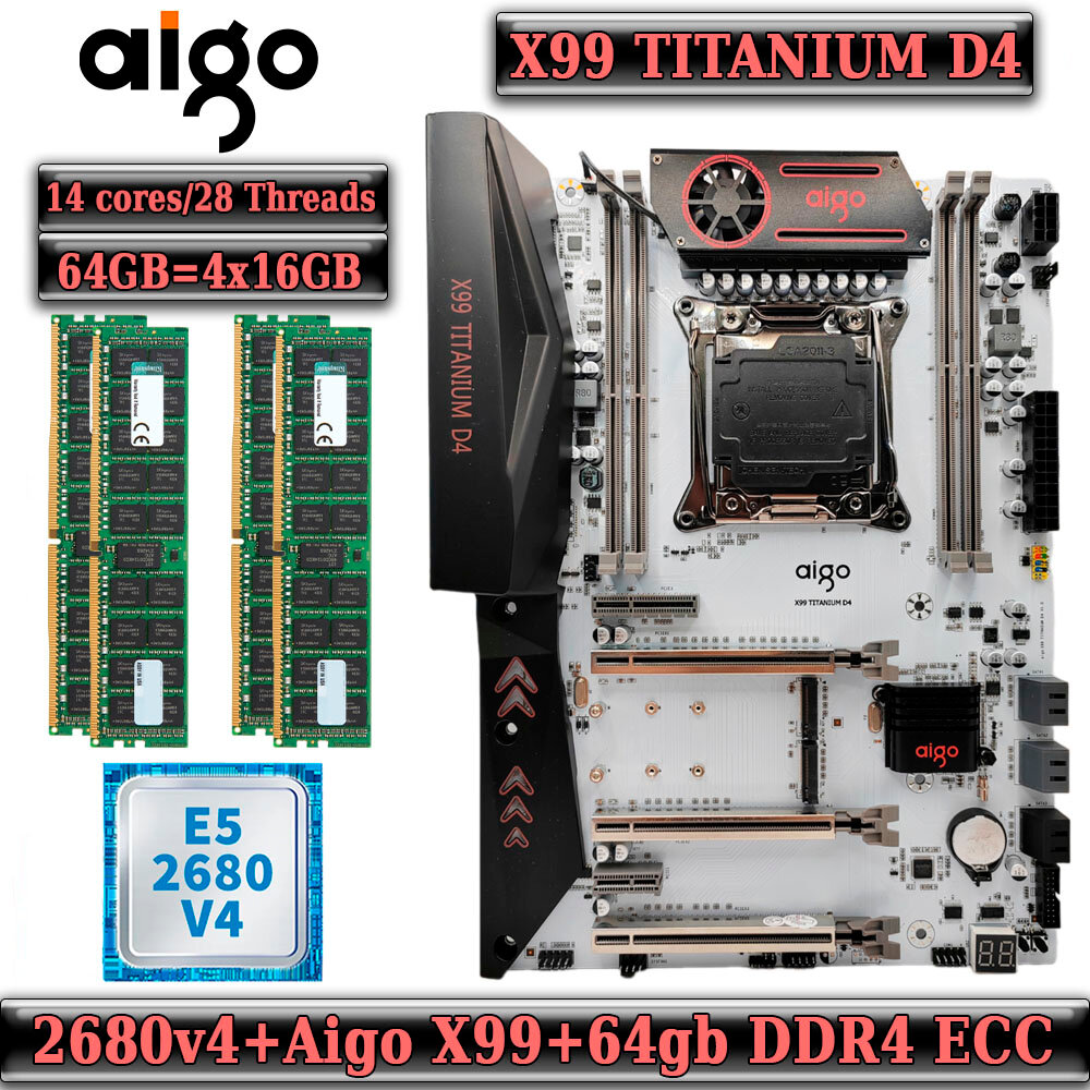 Комплект материнская плата Aigo X99 Titanium D4 + Xeon 2680V4 + 64GB DDR4 ECC 4X16GB Black