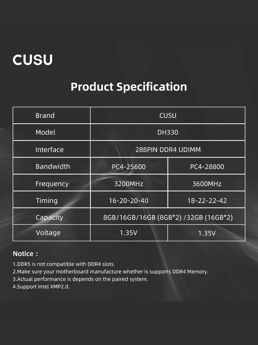 Оперативная память CUSU, DDR4, 8GB, 3200 Мгц, тайминги 16-20-20-40, цвет черный