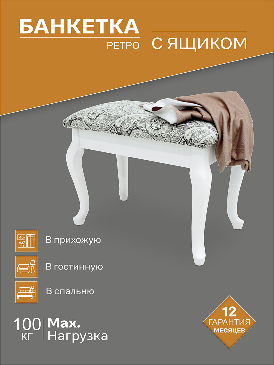 Банкетка-сундук Ретро, Цвет обивки: бежевый, коричневый с бежевым рисунком, Цвет корпуса: белый