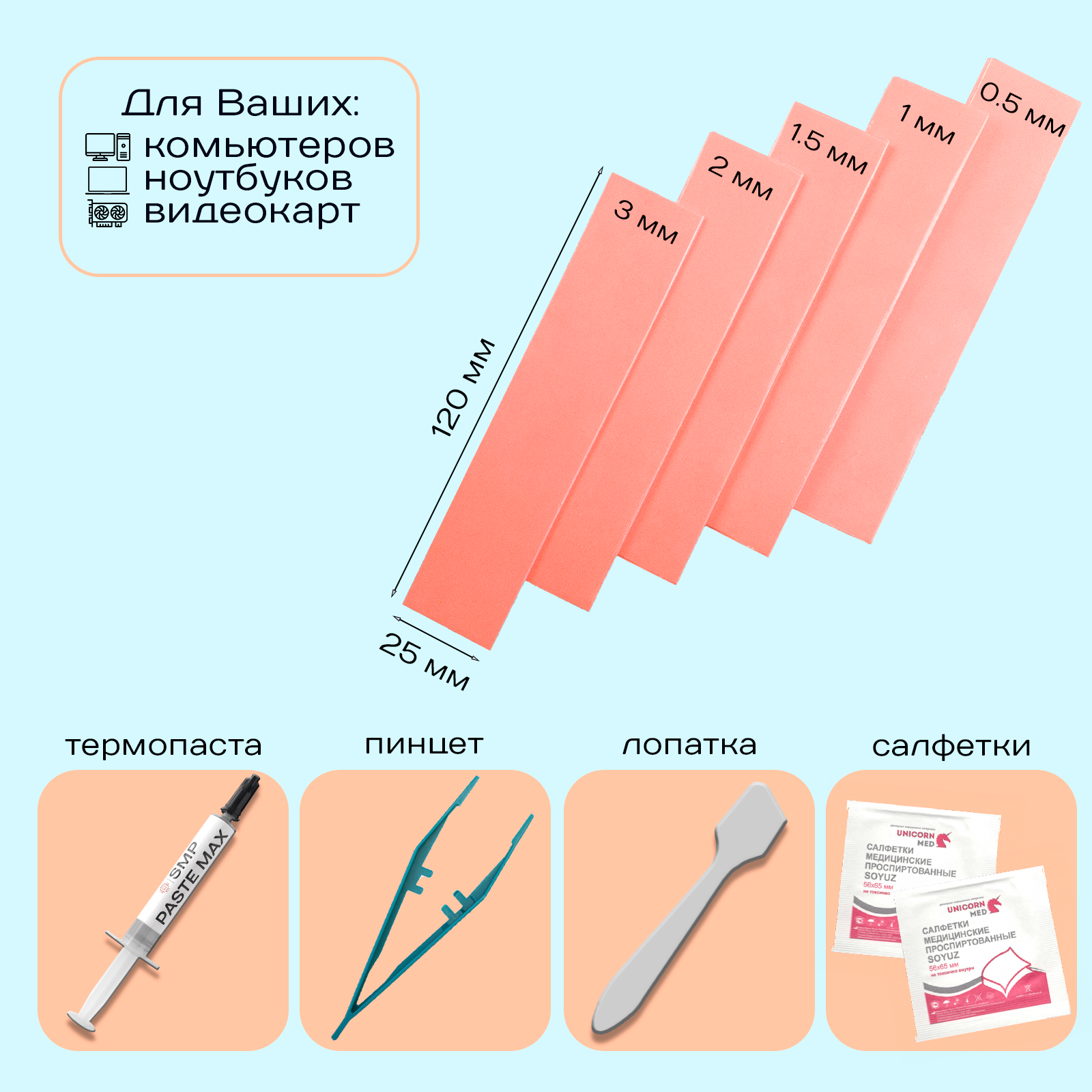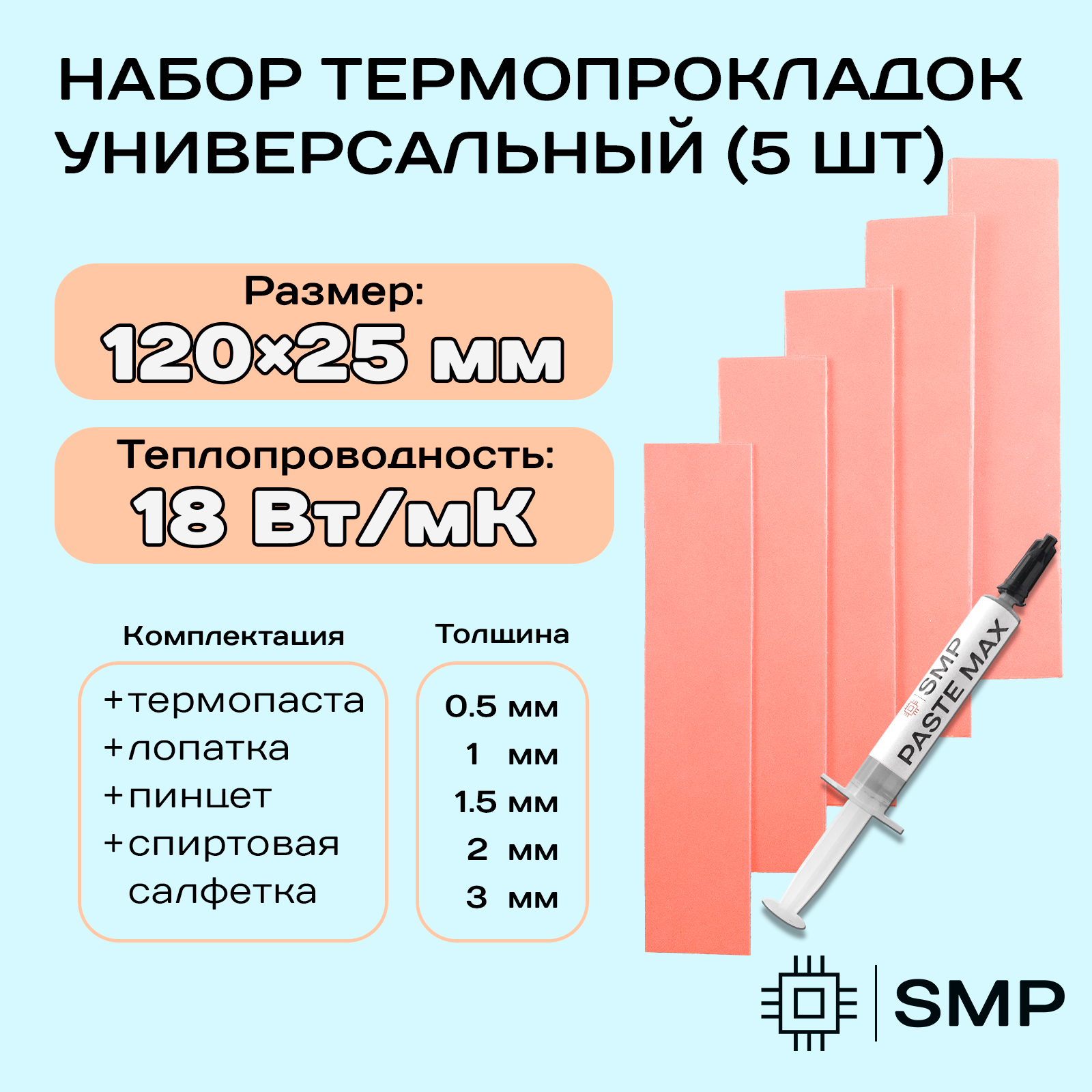 Набор термопрокладок 18Вт/Мк + термопаста. Толщины: 0.5, 1, 1.5, 2, 3мм + термопаста 2г SMP MAX. Термопрокладки для видеокарты, ноутбука, консоли. интересное: